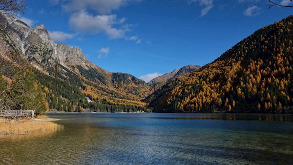 Am Rande des Antholzer Tales liegt der idyllische Antholzer See, der drittgrößte See Südtirols. In seinen klaren Wassern spiegeln sich die dunklen Bäume und majestätischen Gipfel der Rieserfernergruppe.