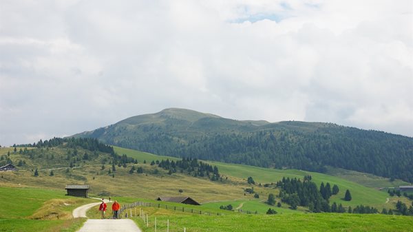 Vom Parkplatz führt der breite Wanderweg teils eben, teils im leichten Anstieg durch lichte Waldstücke und jene weiten, sanft gewellten Almwiesen, die der Rodenecker Alm ihren einzigartigen Liebreiz verleihen. In ihnen entfalten sich malerische Ausblicke auf das vor uns liegende Astjoch und die gegenüberliegende Bergwelt mit dem markanten Peitlerkofel. Unterwegs laden die Ronerhütte und die Starkenfeldhütte zur genüsslichen Zwischenrast.