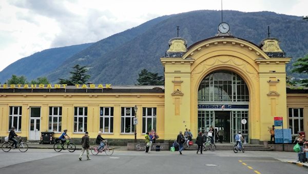1881 also wurde die aufstrebende Kurstadt an das internationale Schienennetz angeschlossen. Damals war der Bahnhof noch stadtnaher gelegen. Das heutige Jugendstil-Bahnhofsgebäude im Westen der Stadt geht indes auf das Jahr 1906 zurück: Im Zuge der Errichtung der Linie Meran-Mals wurde der alte Bahnhof abgerissen und durch einen mondäneren, nordwestlicher gelegenen ersetzt.