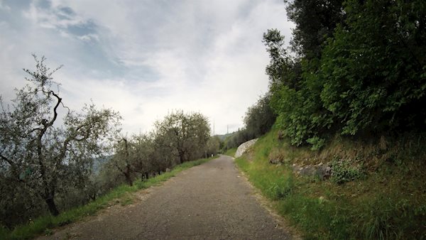 Anfänglich an Häusern, dann an Olivenhainen und Wald vorbei, windet sich das asphaltierte Sträßchen in sieben Kehren nach oben. Bereits während der Auffahrt erschließen sich schöne Ausblicke auf den nördlichen Gardasee und seine Umgebung.