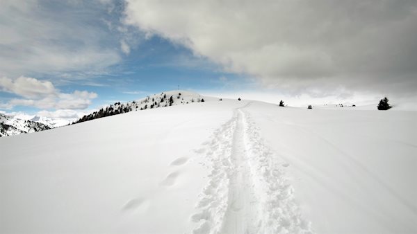 Weiterhin der Wegnummer 26 folgend, führt unsere Skitour nun durch den zunehmend lichter werdenden Nadelwald, der wenig später weiten, tiefverschneiten Almwiesen weicht. Vor der Kulisse des Maurerbergs und des Peitlerkofel schwenkt der Weg schließlich nach rechts und steigt zum weithin sichtbaren Gipfelkreuz des Col da Lech an.