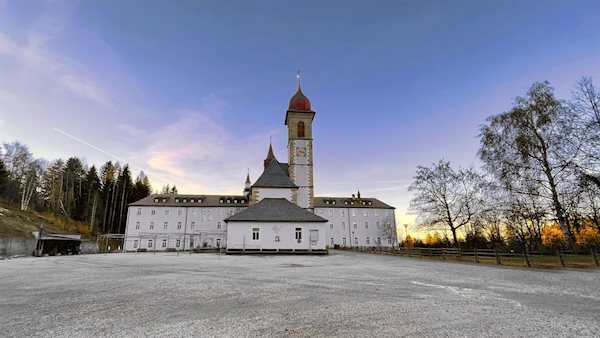 Etwa 20 Minuten später präsentiert sich Maria Weißenstein vor der verträumten Kulisse des Rosengarten, des Latemar und des Weißhorn in einer ausgedehnten Lichtung. Wo heute die barocke Basilika „Unsere liebe Frau“ und das anliegende Kloster thronen, hatte einst eine schlichte Kapelle gestanden. Die Legende erzählt, dass sie in der Mitte des 16. Jahrhunderts vom Bergbauern Leonhard Weißensteiner erbaut worden sei, nachdem ihm die Gottesmutter Maria erschienen und ihn von seiner Krankheit geheilt habe.