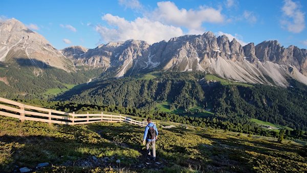 Der Dolomiten Panoramaweg auf der Plose eröffnet atemberaubende Ausblicke auf die nahen Felswände des Peitlerkofel und der Aferer Geisler. Die hier vorgeschlagene Variante führt an der beliebten Schatzerhütte vorbei.