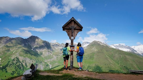 Neben dem anmutigen Gipfelkreuz des Eggespitz entfaltet sich wenig später ein atemberaubend schöner Ausblick auf die ringsum aufstrebenden Berge, von denen namentlich die schneeweiße Gletscherwelt um den Weißzint, den Großen Möseler und den Turnerkamp den Betrachter in ihren Bann schlägt. Aussichtsbänke laden zum Verweilen und Genießen dieser traumverlorenen Idylle ein.