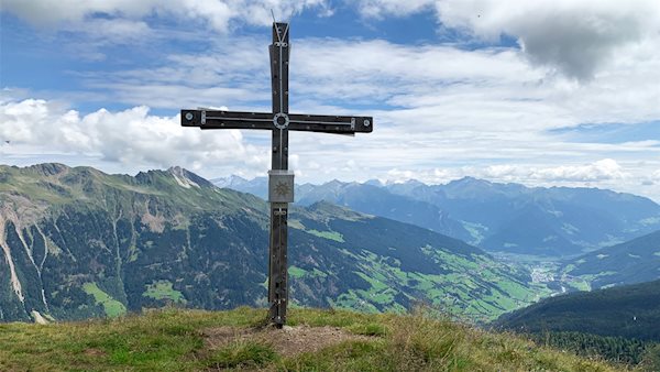 Neben ihrem kleinen Gipfelkreuz öffnet sich ein weitreichender Rundblick ins Ridnauntal, auf den Sterzinger Talkessel und die ringsum aufragenden Berge.