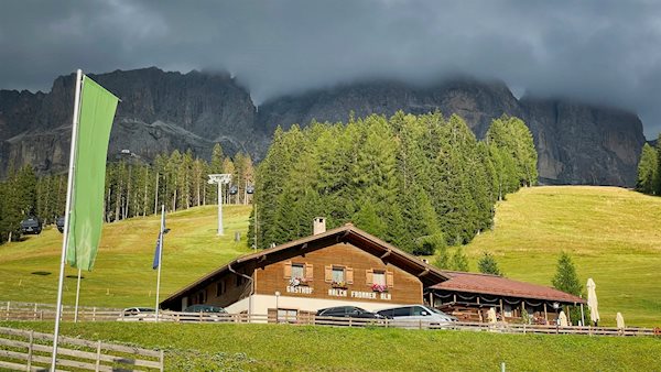 Vor der Kulisse des in der Abendsonne leuchtenden Rosengarten heißen die freundlichen Wirtsleute ihre Gäste willkommen und verwöhnen sie mit lokalen und mediterranen Köstlichkeiten.