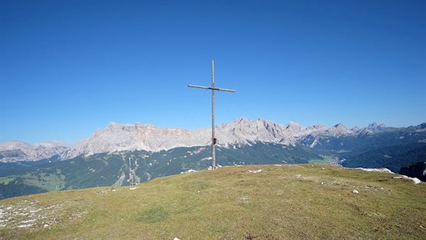 Nördlich der Gardenacia Hütte erhebt sich der aussichtsreiche Col Plö Alt. Trotz seiner vergleichsweise recht bescheidenen Höhe entfaltet sich neben seinem imposanten Gipfelkreuz ein atemberaubend schöner Weitblick auf die nahen Gadertaler Dolomiten und die fernen Zillertaler Alpen.