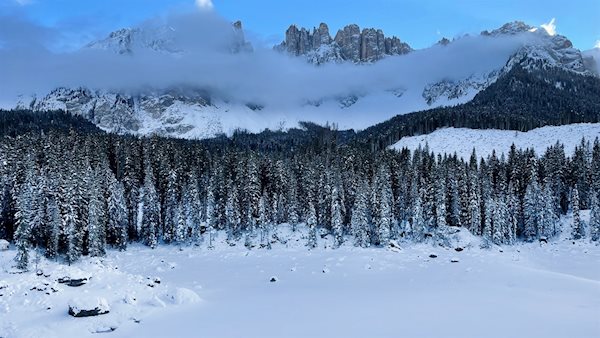 Der Karersee zieht auch im Winter zahlreiche Besucher in seinen Bann. Wenn sich eine dicke Eisdecke über den grün schimmernden Märchensee gelegt hat, führt ein kurzer Rundweg seine Ufer entlang und öffnet dabei schöne Ausblicke auf den Latemar und den Rosengarten.