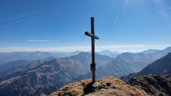 Er steigt bisweilen weglos, aber stets gut markiert über die friedvollen, von zahlreichen Alpenrosen bewachsenen Hänge zum Wetterkreuz auf dem 2.001 m hohen Horn an. Hier erschließt sich ein malerischer Ausblick auf das Ridnauntal und die ringsum aufragende Bergwelt.