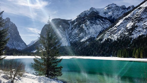 Unsere Langlauftour startet am Parkplatz direkt bei der Nordic Arena in Toblach. Dem Wegweiser „Dürrensee-Runde“ folgend, starten wir auf der Loipe den 24 km langen Rundweg und passieren zunächst einen schönen Waldweg. Rechts von uns schlängelt sich ein Bach durch die Landschaft, teils gefroren, teils leicht plätschernd. Nach ca. zehn Minuten lichtet sich der Wald und eröffnet einen herrlichen Ausblick auf den Toblacher See, auf dem sich Enten und Schwäne tummeln. Das klare Wasser leuchtet im Sonnenschein stahlblau, im Hintergrund erheben sich die Berge des Naturparks Fanes-Sennes-Prags.