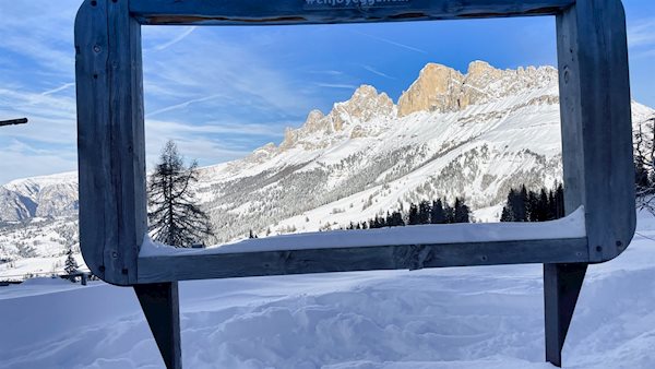 Neben der Panoramatafel, den schneebedeckten Kinosesseln und dem schlichten Holzkreuz entfaltet sich schließlich eine malerische Bergszenerie. Der Blick schweift von der tieferliegenden Siedlung Karersee über den Schlern zum sagenumwobenen Rosengarten und dem daneben aufstrebenden Latemar – eine Kinovorstellung der besonderen Art, in der die Natur Regie führt und die im Mittelpunkt stehenden Berge durch Sonne, Wolken, Schnee und Schneegestöber im immer neuen Licht erstrahlen.