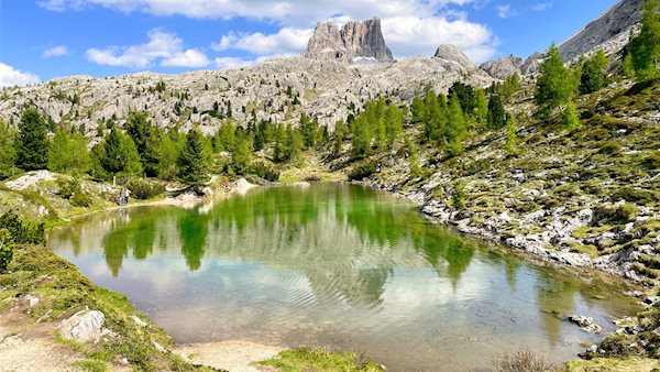 Nach der idyllischen Uferrast wandert man zu seinem Ostufer zurück, an dem ein kleiner (anfangs noch nicht ausgeschilderter) Steig in Richtung Falzaregopass abzweigt. Mit Blick auf den spitz zulaufenden Sas de Stria und den wuchtigen Lagazuoi führt er durch weite Bergwiesen und geht wenig später in den breiten, zum Falzaregopass abfallenden Weg Nr. 441 über.