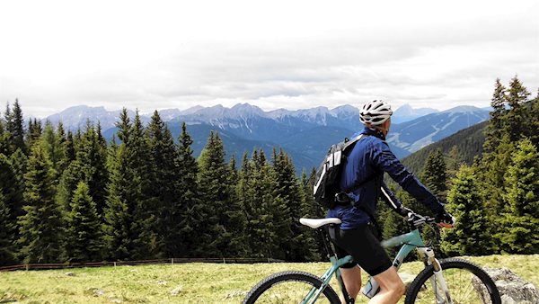 Die Mountainbiketour zur Taistner Alm folgt teils asphaltierten, teils schottrigen Wegen mit herrlichen Ausblicken auf die Dolomiten.