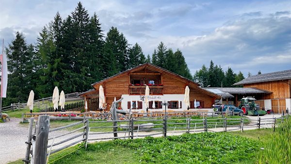 Hinter dem Hotel Schwarzhorn weist das Wanderschild Nr. 1 den Weg zur Neuhütt Alm. Er quert im leichten Anstieg teils baumbestandene Weidewiesen und öffnet dabei schöne Ausblicke auf das nahe Weißhorn auf der linken und den Rosengarten, den Latemar und den Zanggen auf der rechten Seite.