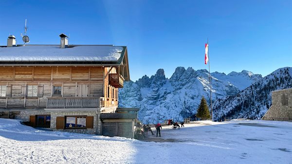 Nach etwa 450 bewältigten Höhenmetern lichtet sich der Wald, hinter dem sich die Wanderung vor der verträumten Kulisse der umliegenden Dolomiten durch verschneite Almwiesen zur Dürrensteinhütte und zum daneben thronenden, bereits sichtbaren Festungswerk fortsetzt.