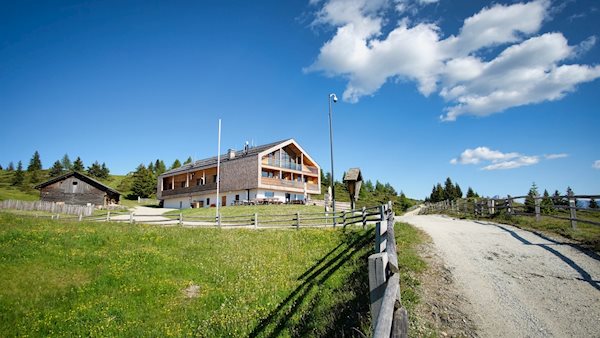 An der nächsten Weggabelung folgt man dem rechts abzweigenden Almweg Nr. 2, der sich vor der Kulisse des Astjochs und des seitlich aufragenden Peitlerkofel zur nunmehr nahen Starkenfeldhütte zieht.