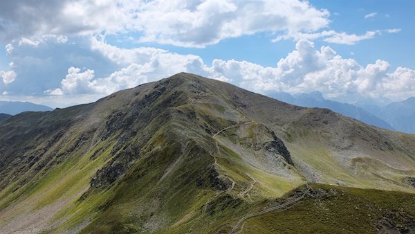 Weiterhin der Wegnummer 25 folgend, führt die Wanderung im mittelsteilen Anstieg auf den Gipfel des grasbewachsenen Toblacher Pfannhorn. Neben seinem schlichten Gipfelkreuz entfaltet sich schließlich ein erlesener 360-Grad-Blick auf den Pustertaler Talkessel und die umliegende Bergwelt. Neben den bereits erwähnten Zacken und Felsnadeln der östlichen Dolomiten schweift der Blick auch über den nahen Golfen zur Ahrntaler, Gsieser und Defregger Bergwelt.
