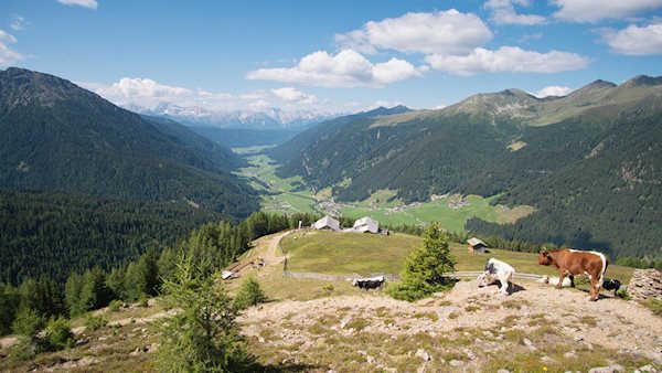 Hoch über St. Magdalena verheißt die sonnenverwöhnte Uwaldalm wonnesame Genussmomente vor der malerischen Kulisse der Pragser Dolomiten und des tiefer liegenden Gsieser Tales.