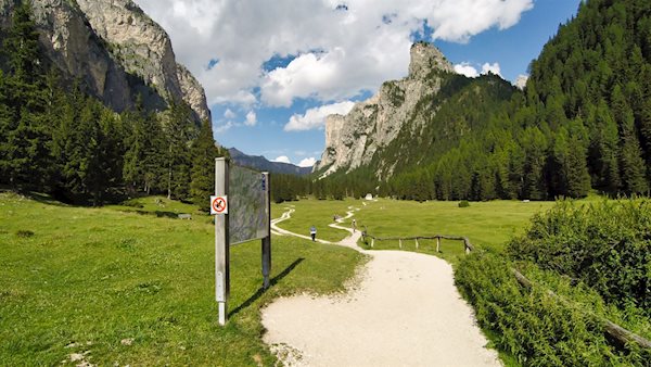 Vom Parkplatz führt der nahezu ebene Wanderweg Nr. 14 durch dieses langgezogene, von den imposanten Felswänden des Steviastocks, des Puezmassivs, der Chedulberge und des Col Turond eingerahmte Trogtal, in dem eine bunte Vielfalt teils seltener Blumen gedeiht. Wegbegleiter ist das glucksende Talbächlein, das dann und wann im Erdreich verschwindet, um wenig später wieder aufzutauchen.
