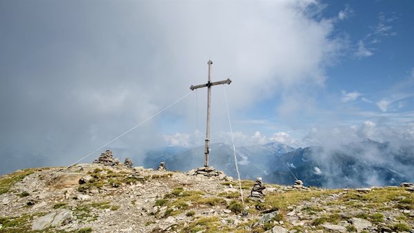 Nach einer guten Stunde sanften Anstiegs erreicht man das elegante und zugleich schlichte Gipfelkreuz des Zinseler, neben dem sich einige Steinmännchen auftürmen. Erschlossen sich bereits während des Anstiegs schöne Ausblicke, entfaltet sich hier oben ein ungeahnt weitreichendes Panorama: Während sich zu unseren Füßen das Wipptal mit dem Fuggerstädtchen Sterzing, seinen Seitentälern und Freienfeld ausdehnt, schweift unser Blick über die Sarntaler, Zillertaler und Stubaier Alpen. Selbst die bleichen Dolomiten lassen sich in der Ferne ausmachen.