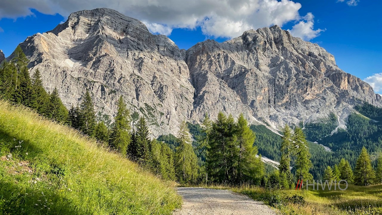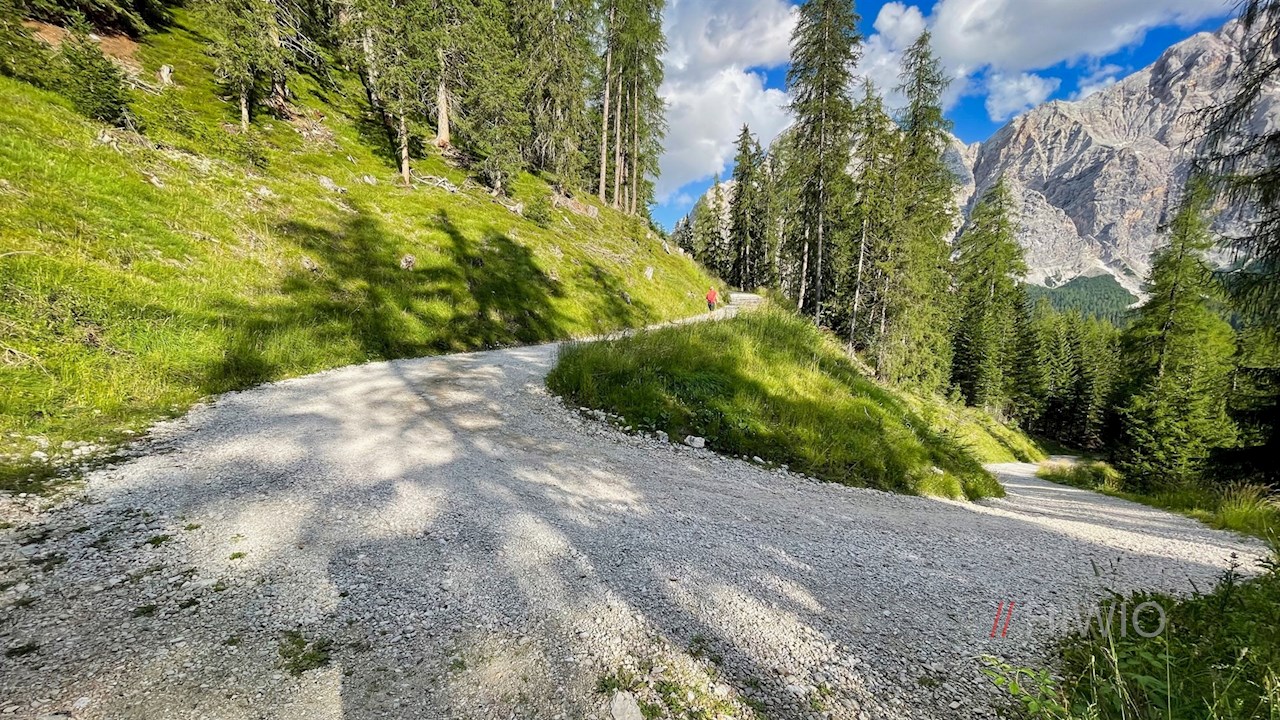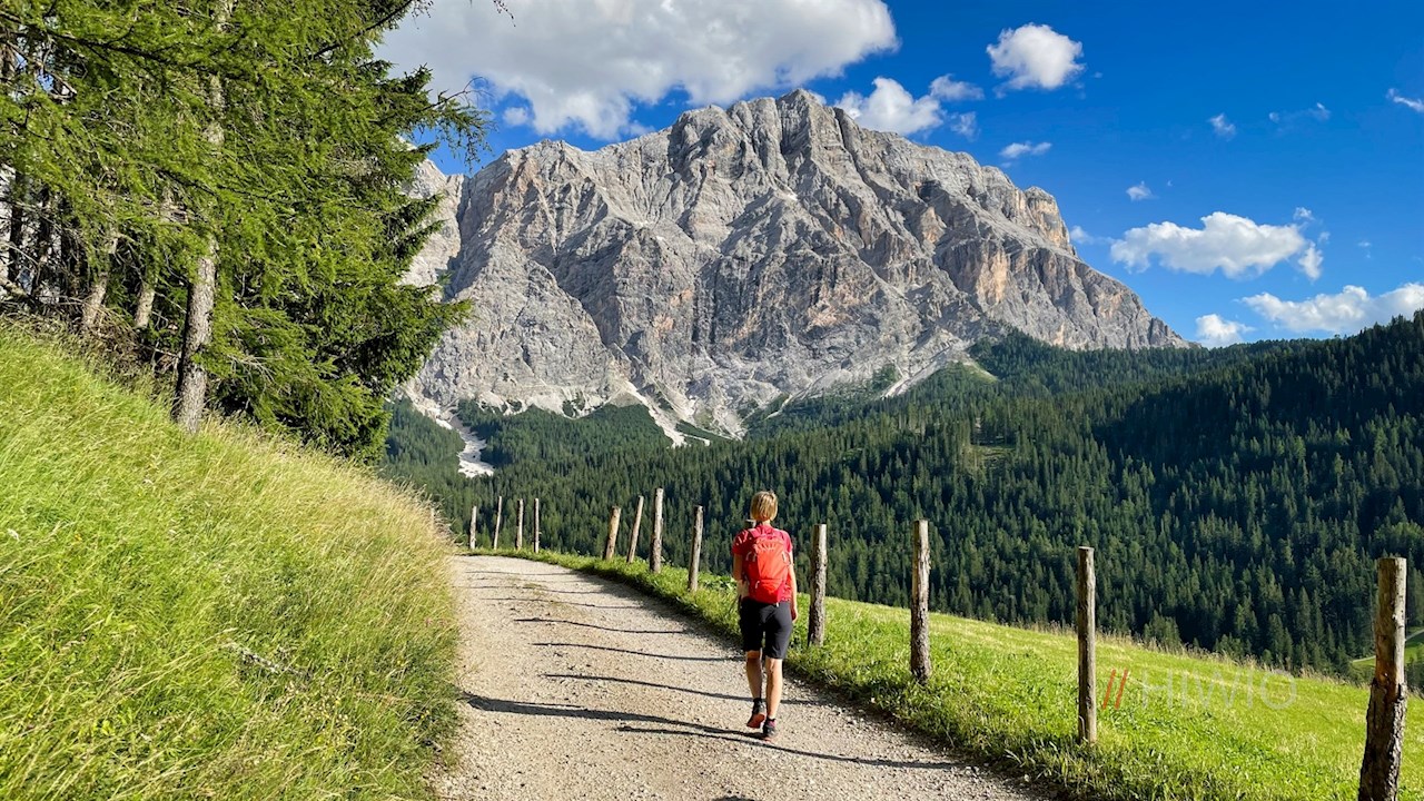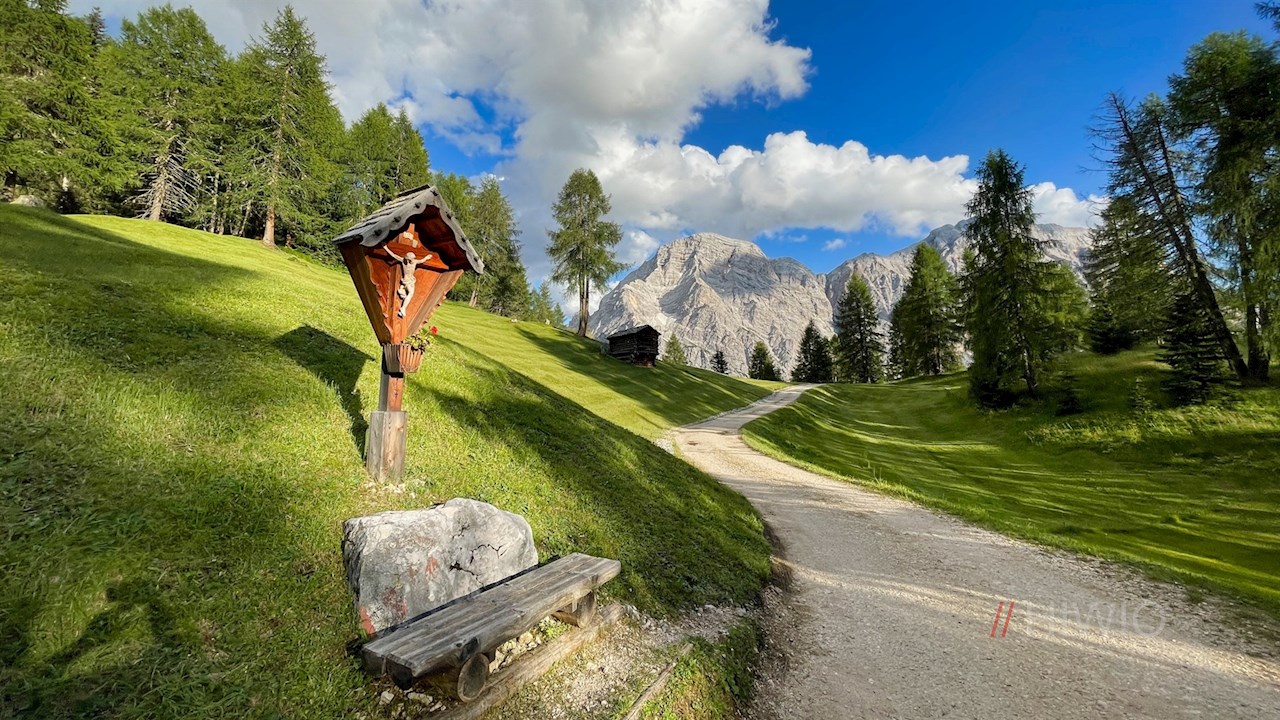 Am Parkplatz zweigt der breite Wanderweg Nr. 15 (später 16) zur Ütia da Rit ab. Er schlängelt sich im angenehmen Anstieg durch lichte Waldstücke und malerische Almwiesen, in denen sich immer neue Perspektiven auf die mächtigen Felswände der nahen Kreuzkofelgruppe öffnen.