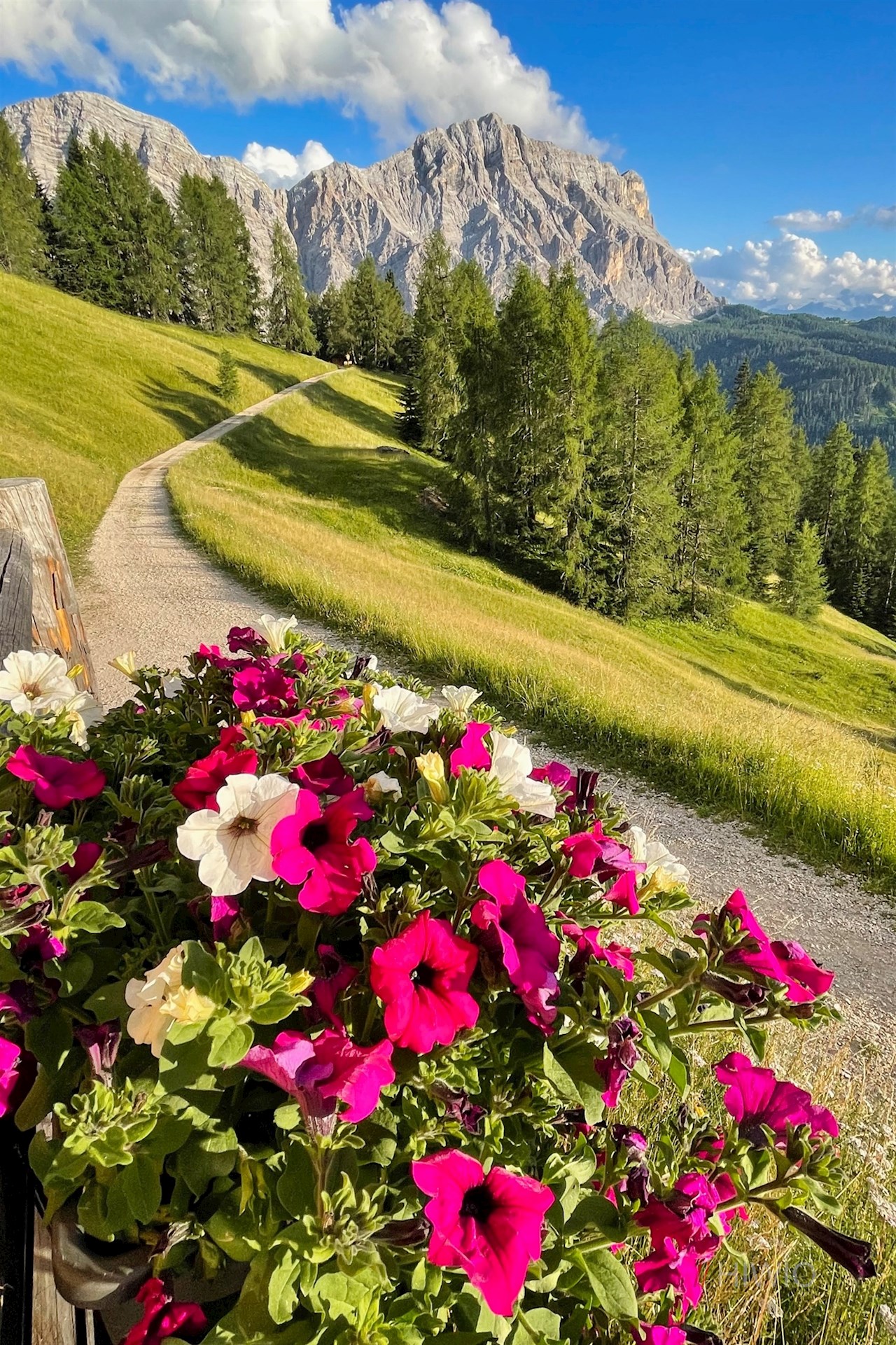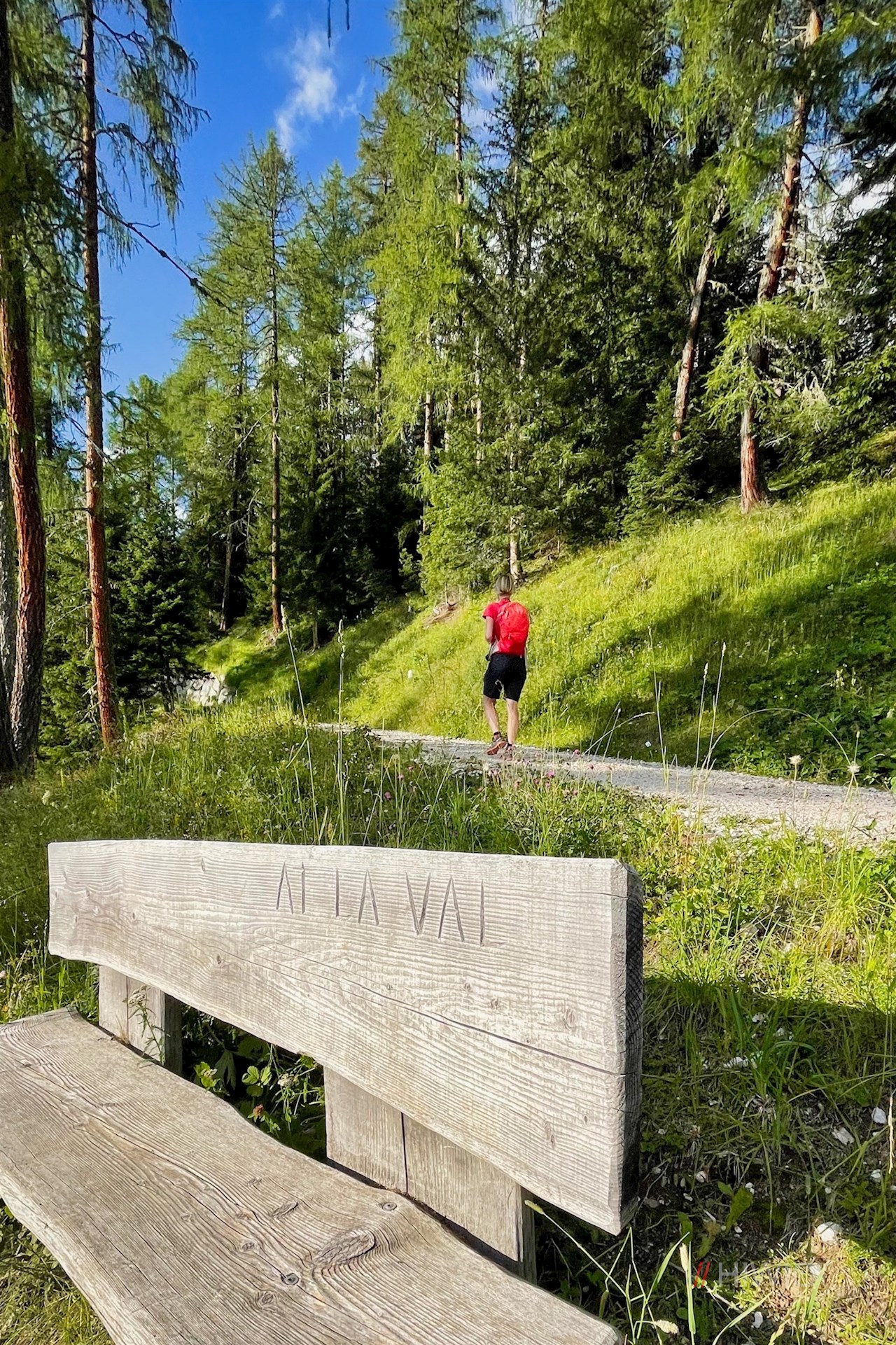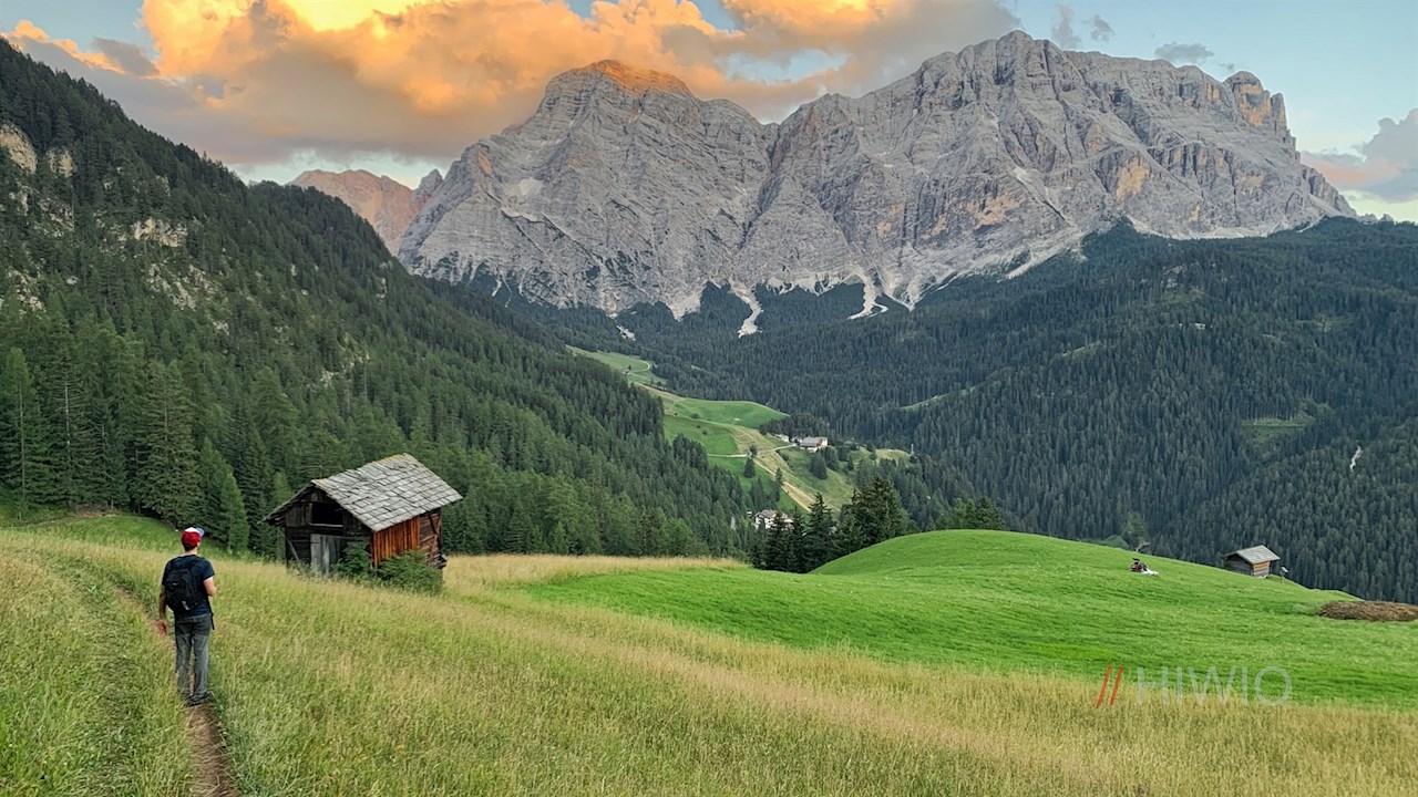 Am Parkplatz zweigt der breite Wanderweg Nr. 15 (später 16) zur Ütia da Rit ab. Er schlängelt sich im angenehmen Anstieg durch lichte Waldstücke und malerische Almwiesen, in denen sich immer neue Perspektiven auf die mächtigen Felswände der nahen Kreuzkofelgruppe öffnen.