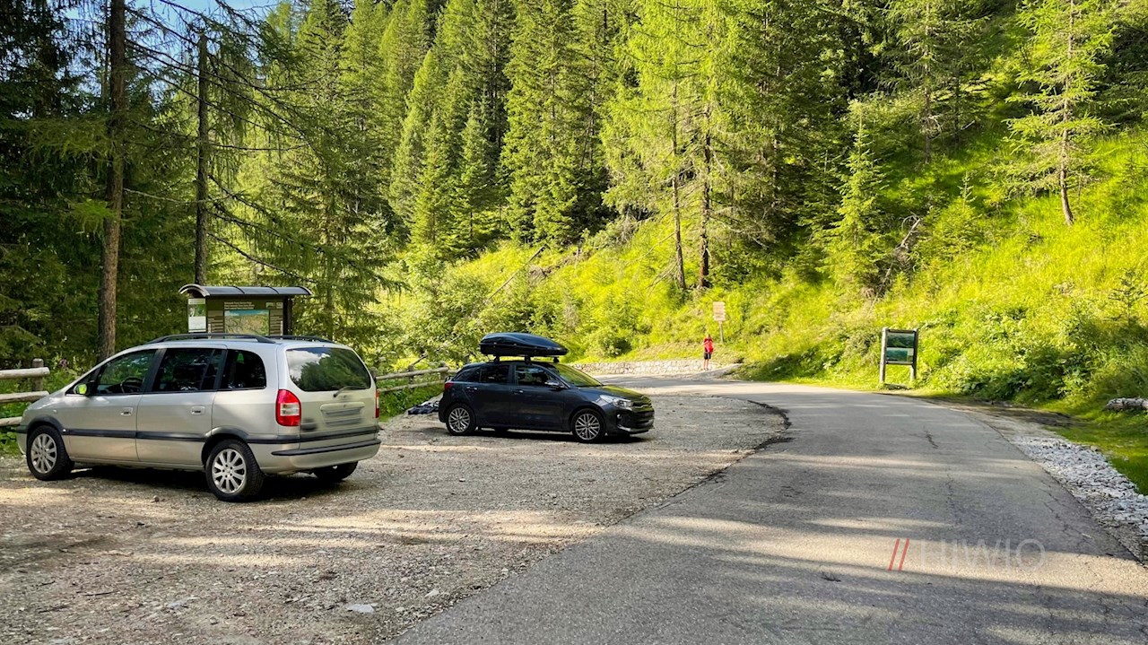 Die Wanderung zur Ütia da Rit beginnt auf einem der Wanderparkplätze hinter dem Hotel Ciurnadú bei Wengen.