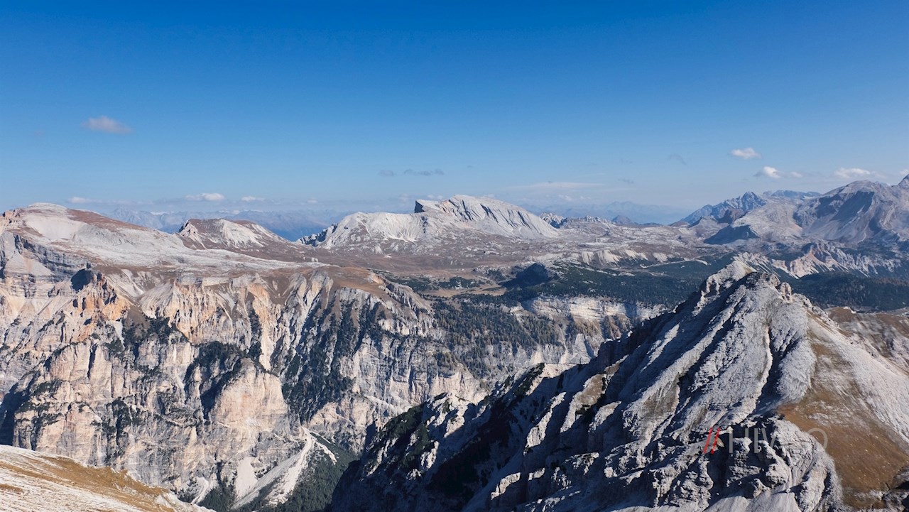 Auf 2.655 m Höhe erschließt sich schließlich ein im wahrsten Sinne des Wortes schwindelerregend schöner Ausblick: Während ringsum markante Dolomitengipfel wie der Peitlerkofel, der Muntejela de Senes, der Seekofel, die Hohe Gaisl, der Col Bechei, die Tofane oder die Lavarella in die Höhe ragen, zeichnen sich in der Ferne die Zillertaler Alpen ab.