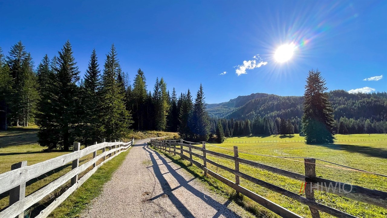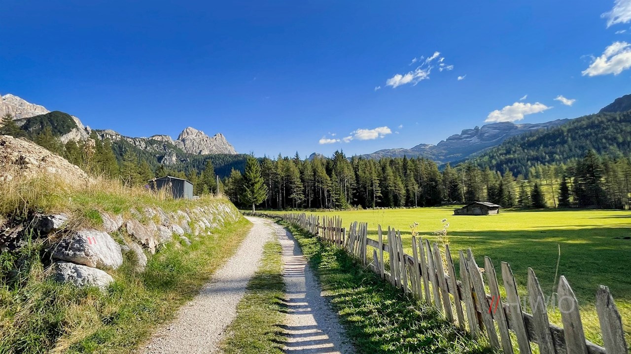 Auf der gegenüberliegenden Straßenseite zweigt der Wiesenweg Nr. 24B ab, der wenig später an eine Weggabelung führt. Während links der Weg zur beliebten Valparola Alm ansteigt, führt der rechts abzweigende Weg Nr. 18 (später 24A) nach Armentarola zurück.