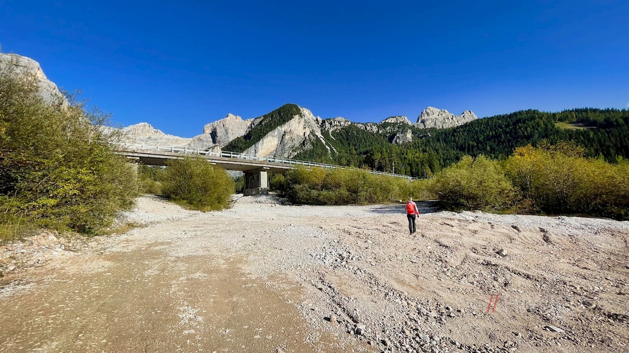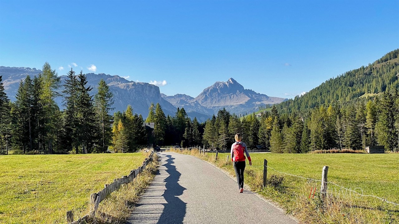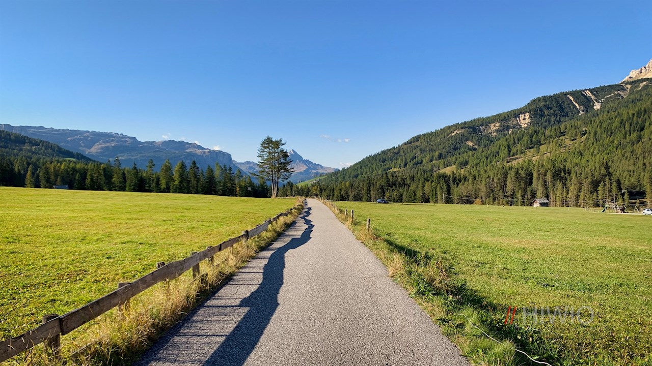 Er führt vor der beeindruckenden Kulisse der umliegenden Dolomiten zunächst sanft ansteigend, dann großenteils eben durch Wiesen und zuletzt entlang der Straße nach Armentarola, wo im Winter das Skigebiet Alta Badia beginnt.