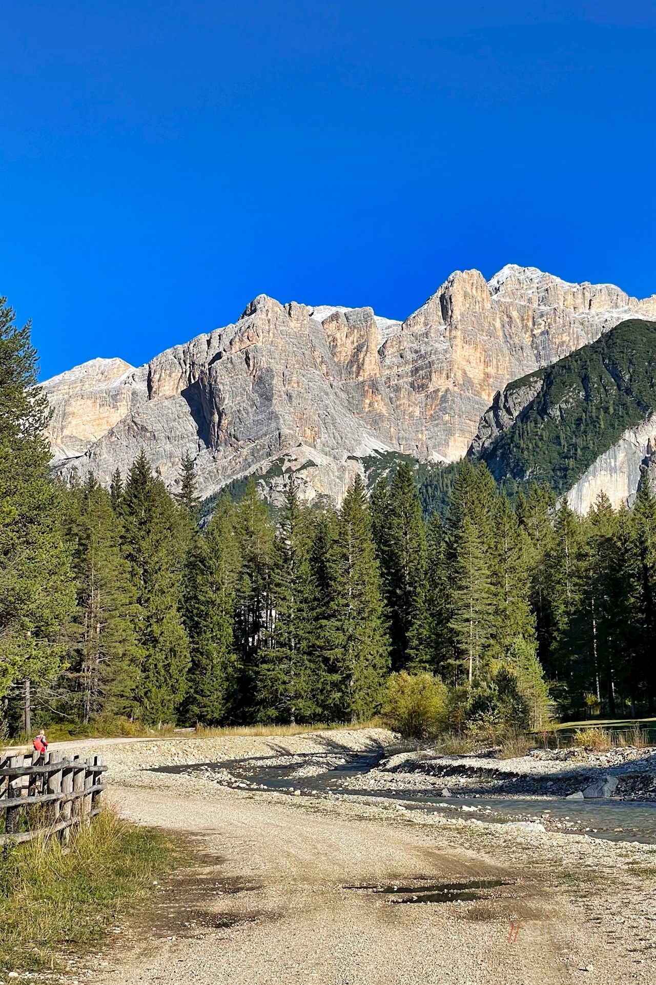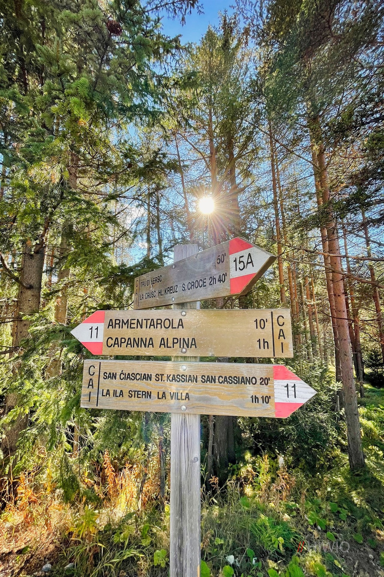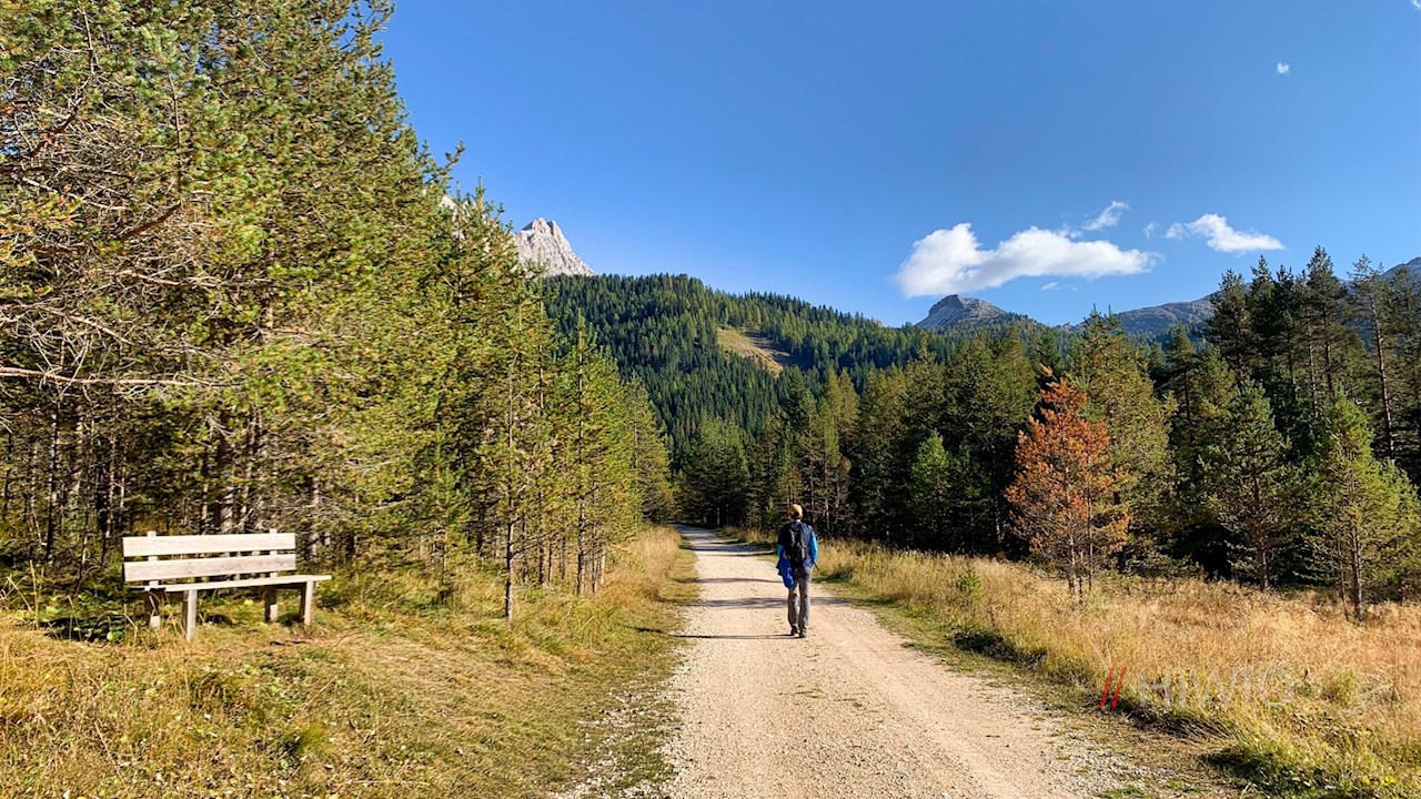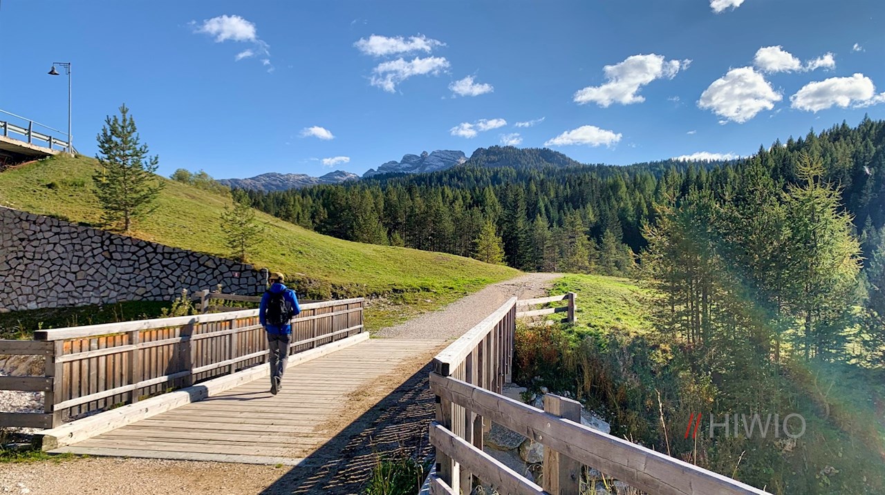 Dem Wanderschild Nr. 11 in Richtung Armentarola folgend, führt die Wanderung zunächst an der Talstation der nahen Seilbahn Piz Sorega vorbei, hinter der sie in einen breiten Wanderweg übergeht.