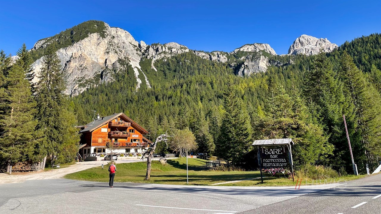 Wenig später lädt das gemütliche Restaurant/Konditorei Sare am Fuße des Conturines und des Lagazuoi zur genüsslichen Einkehr. Während es sich die Erwachsenen in der lauschigen Gaststube oder auf der Sonnenterrasse gemütlich machen können, dürfen sich die Kinder auch auf einen kleinen Spielplatz freuen.