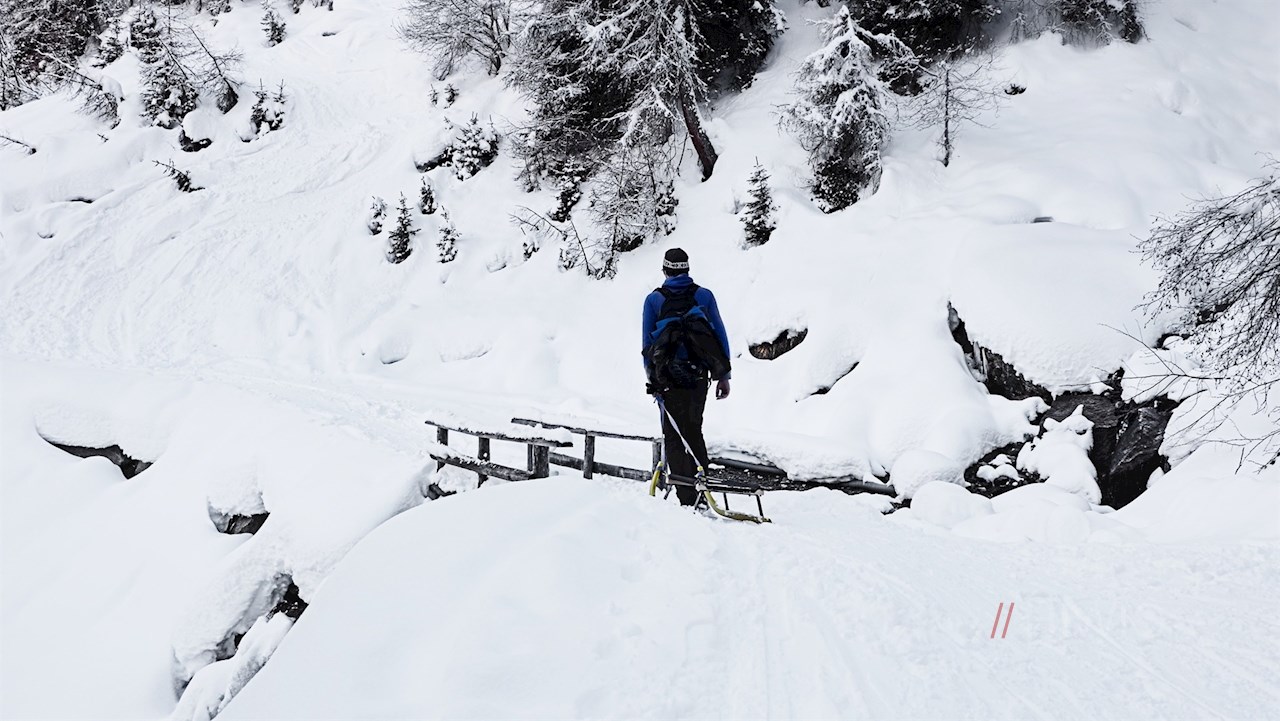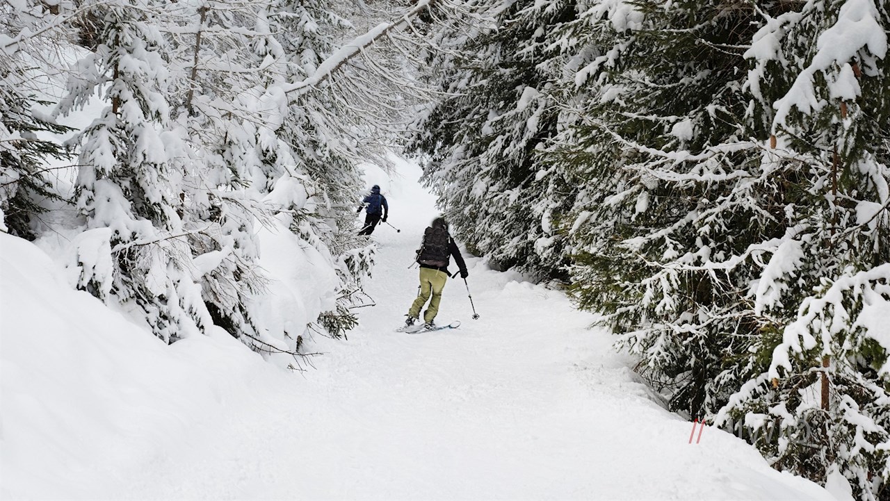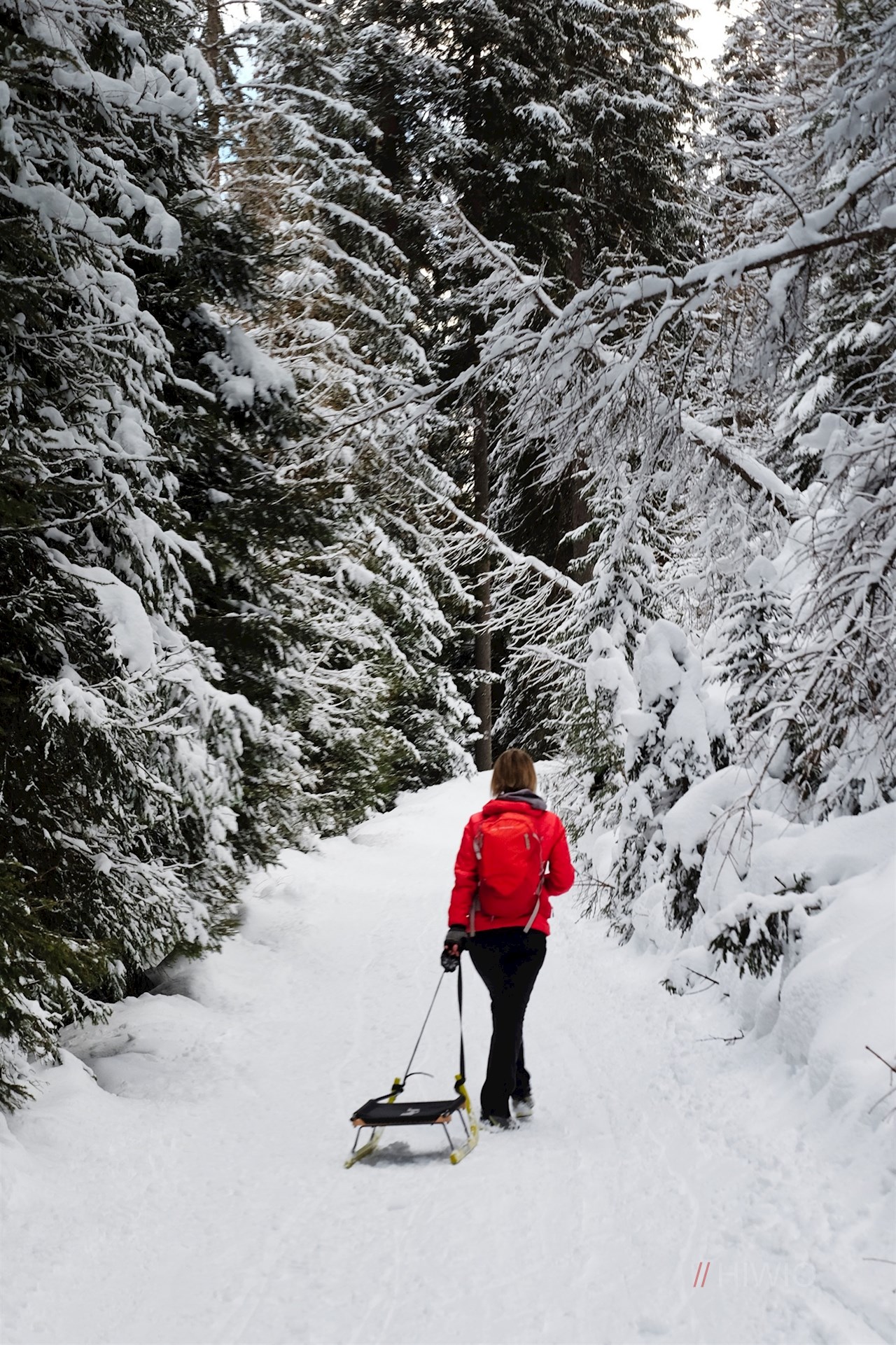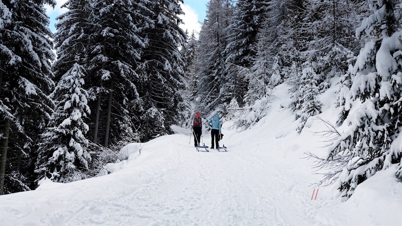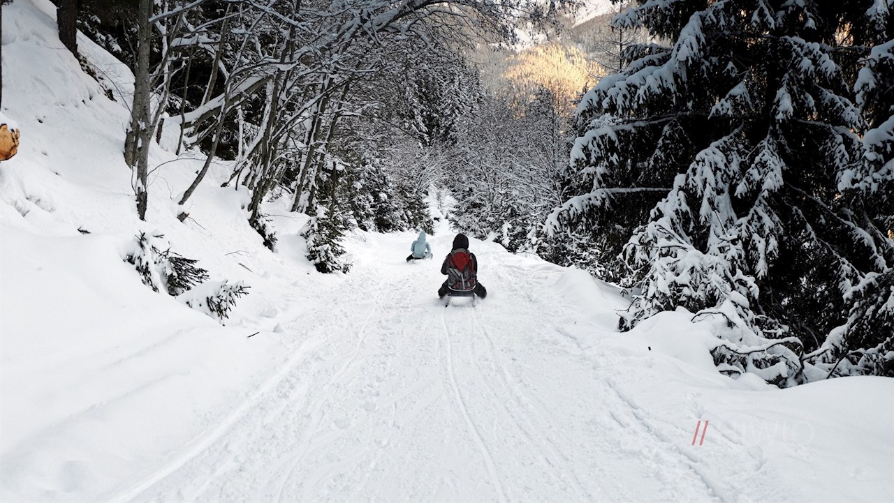 Auf die genussreiche Einkehr folgt für Rodler und Skitourengeher der schwungvollste Teil der Wanderung: die kurvenreiche Abfahrt auf dem idyllischen Anstiegsweg.