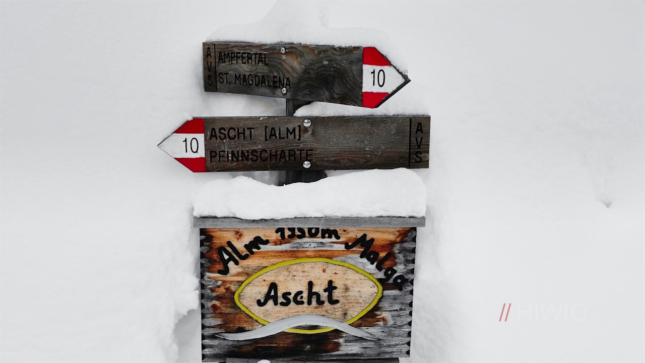 Nach der Überquerung des lauschigen Kaserbaches lichtet sich der Wald allmählich. Nun ist die idyllische Aschtalm nicht mehr fern: Inmitten tiefverschneiter Almwiesen lädt sie nahe der Waldgrenze zur genüsslichen Einkehr vor traumverlorener Kulisse.