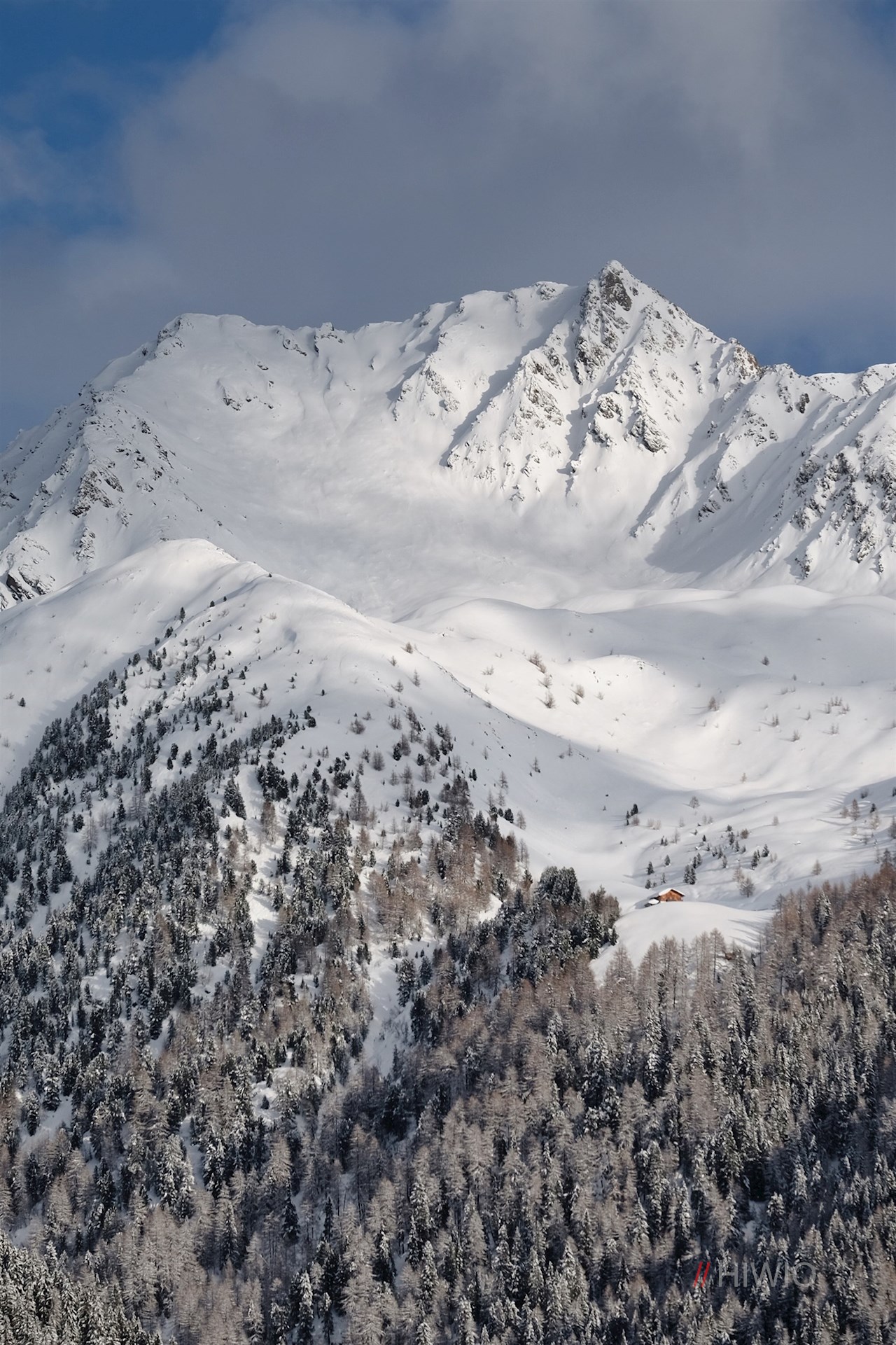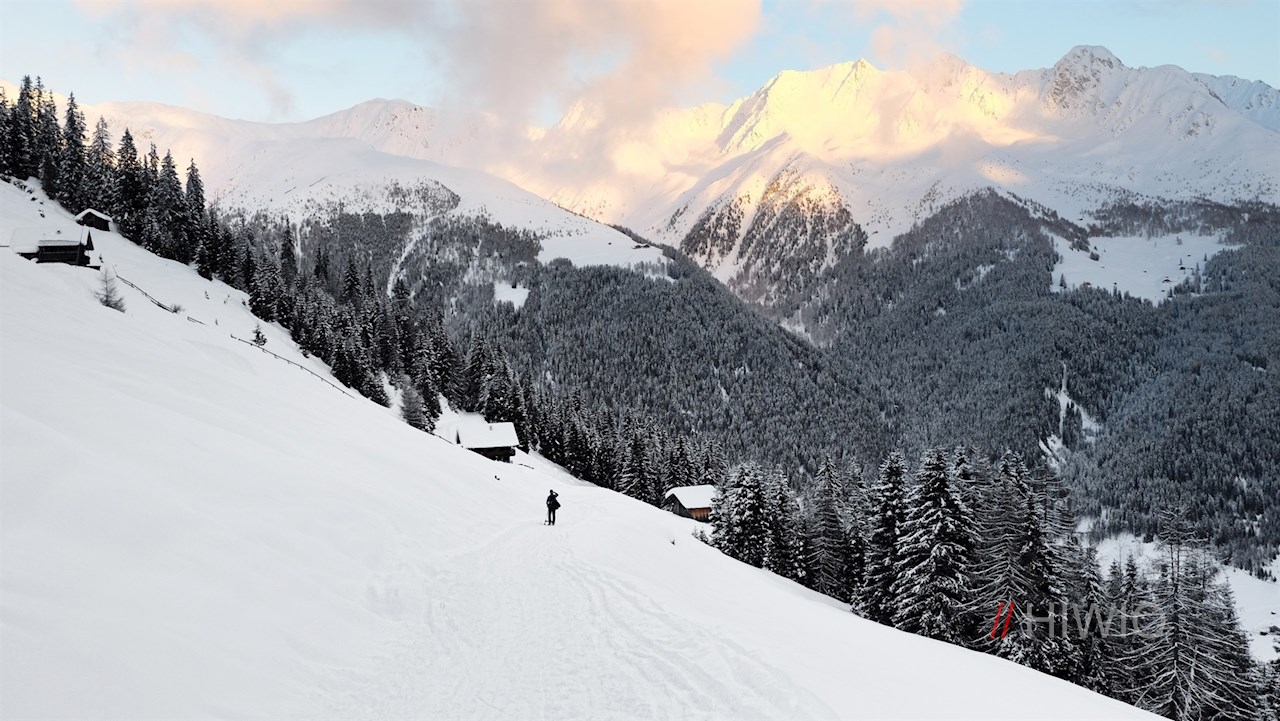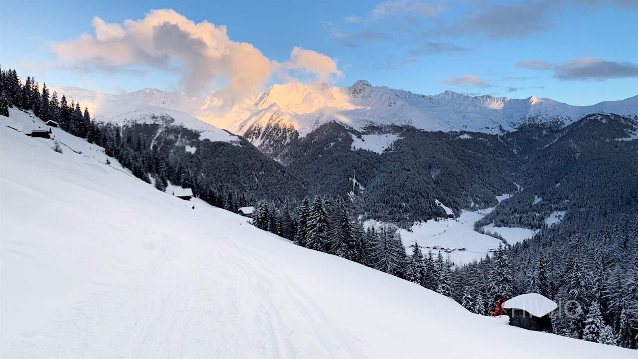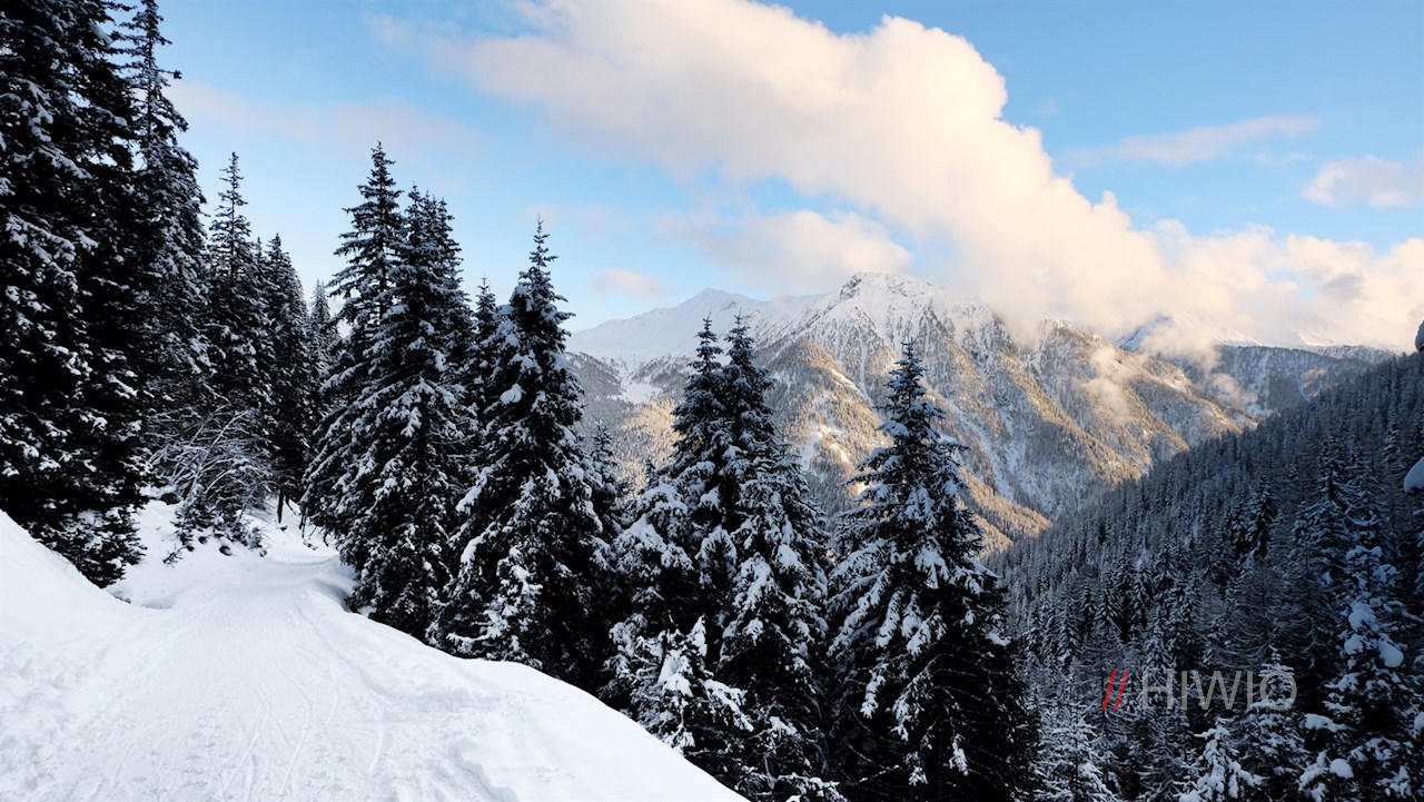 Sie schlängelt sich im angenehmen Anstieg durch den winterlichen Nadelwald, der dann und wann schöne Ausblicke auf die Gsieser Bergwelt und den markanten Dürrenstein freigibt.