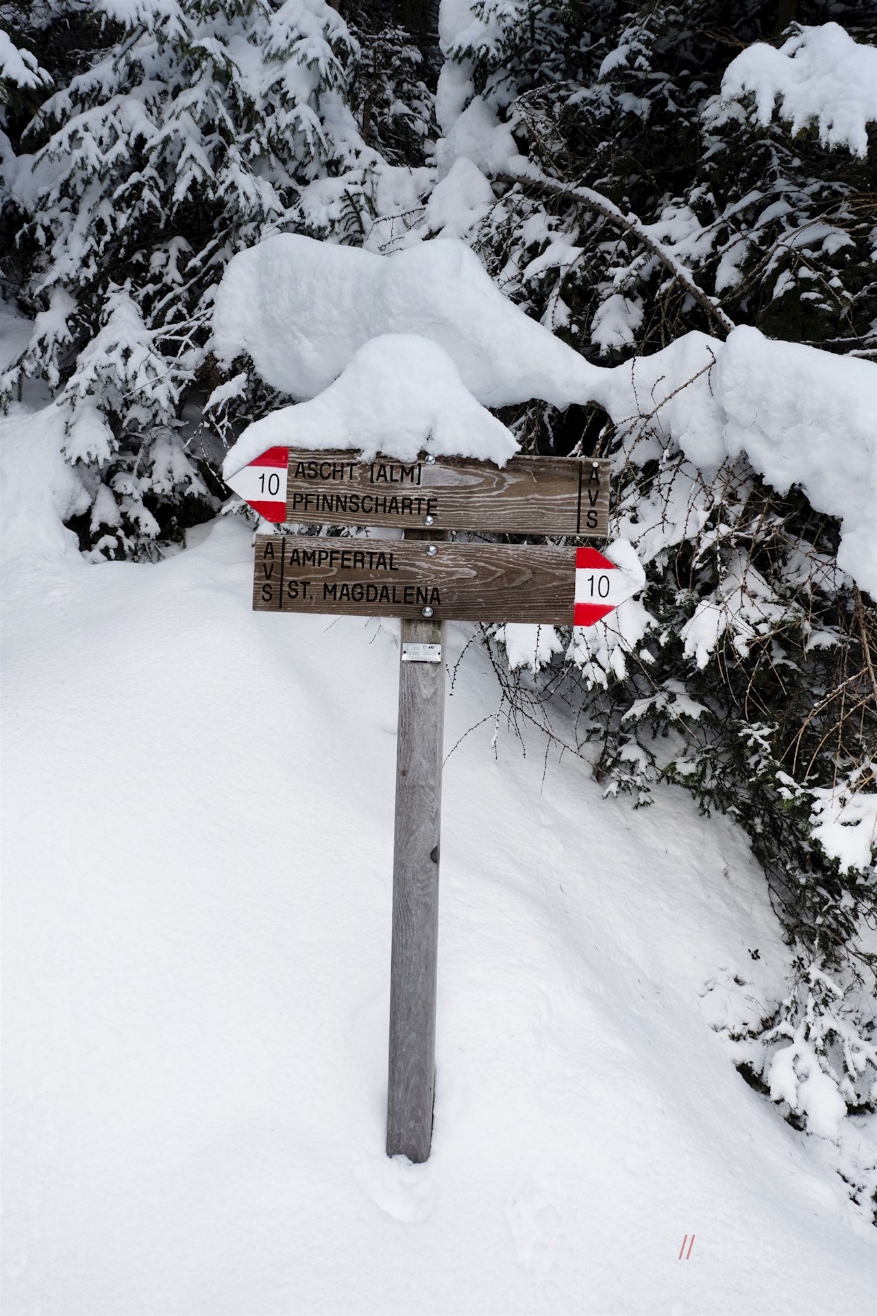 Hinter den letzten Häusern des Weilers Ampfertal wendet sich der Weg nach rechts und führt ein kurzes Stück am Rand (!) der Skipiste entlang. So gelangt man zum Beginn der gut gebahnten Rodelbahn, die wenig später links abzweigt.