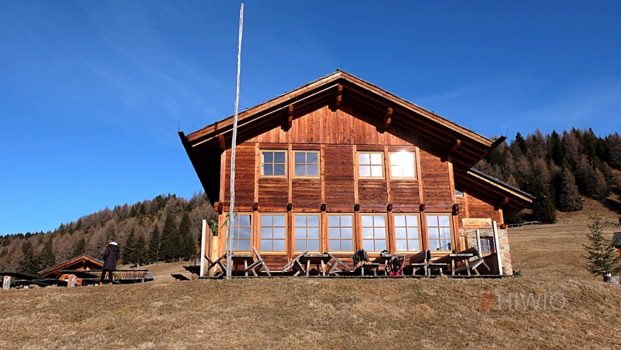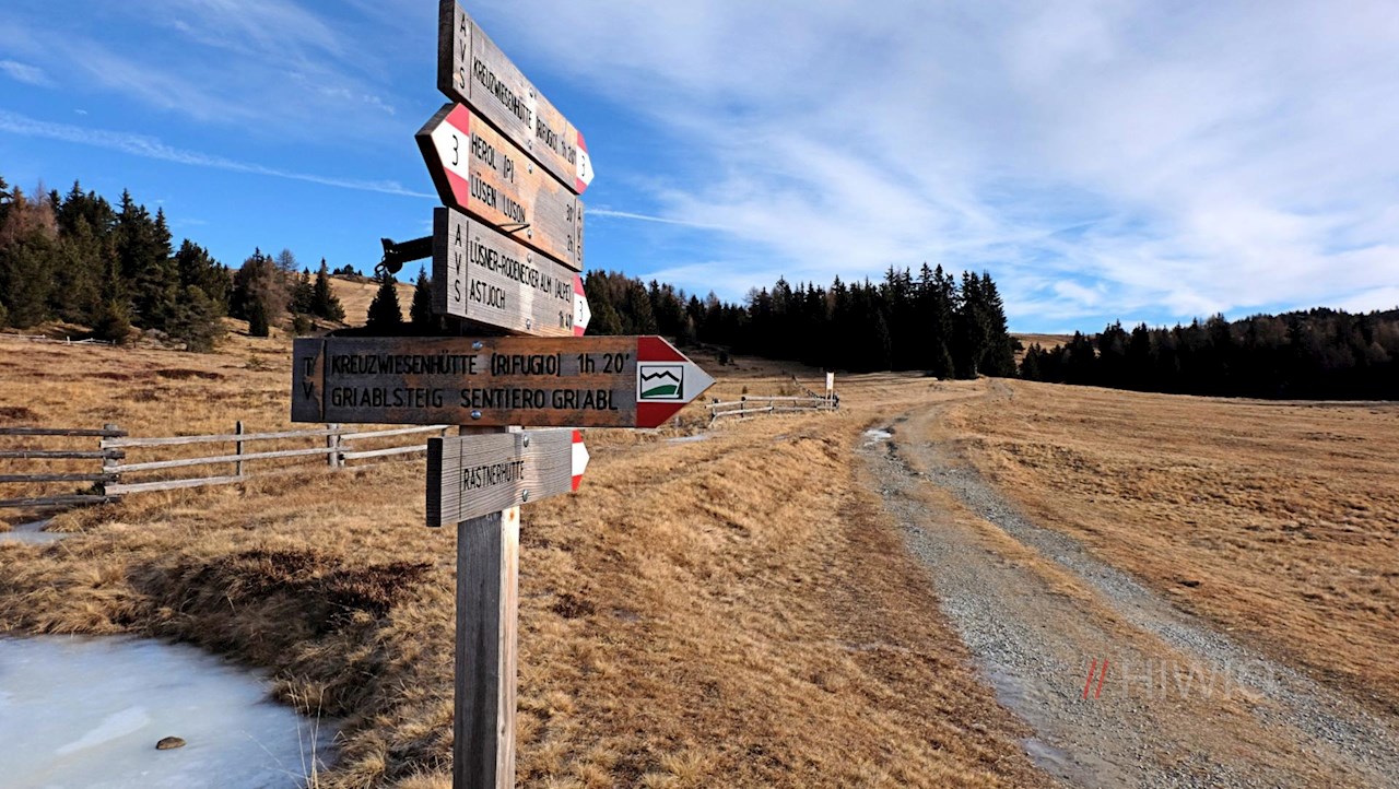 Kurz vor der Kreuzwiesenalm zweigt rechts der nahezu eben verlaufende Weg Nr. 2A ab, der sich zur beliebten Kreuzwiesenhütte schlängelt. Mit Blick auf den Peitlerkofel, die Aferer Geisler, den Plosestock und die in der Ferne aufragenden Sarntaler Alpen lädt diese wenig später zur genüsslichen Zwischenrast.