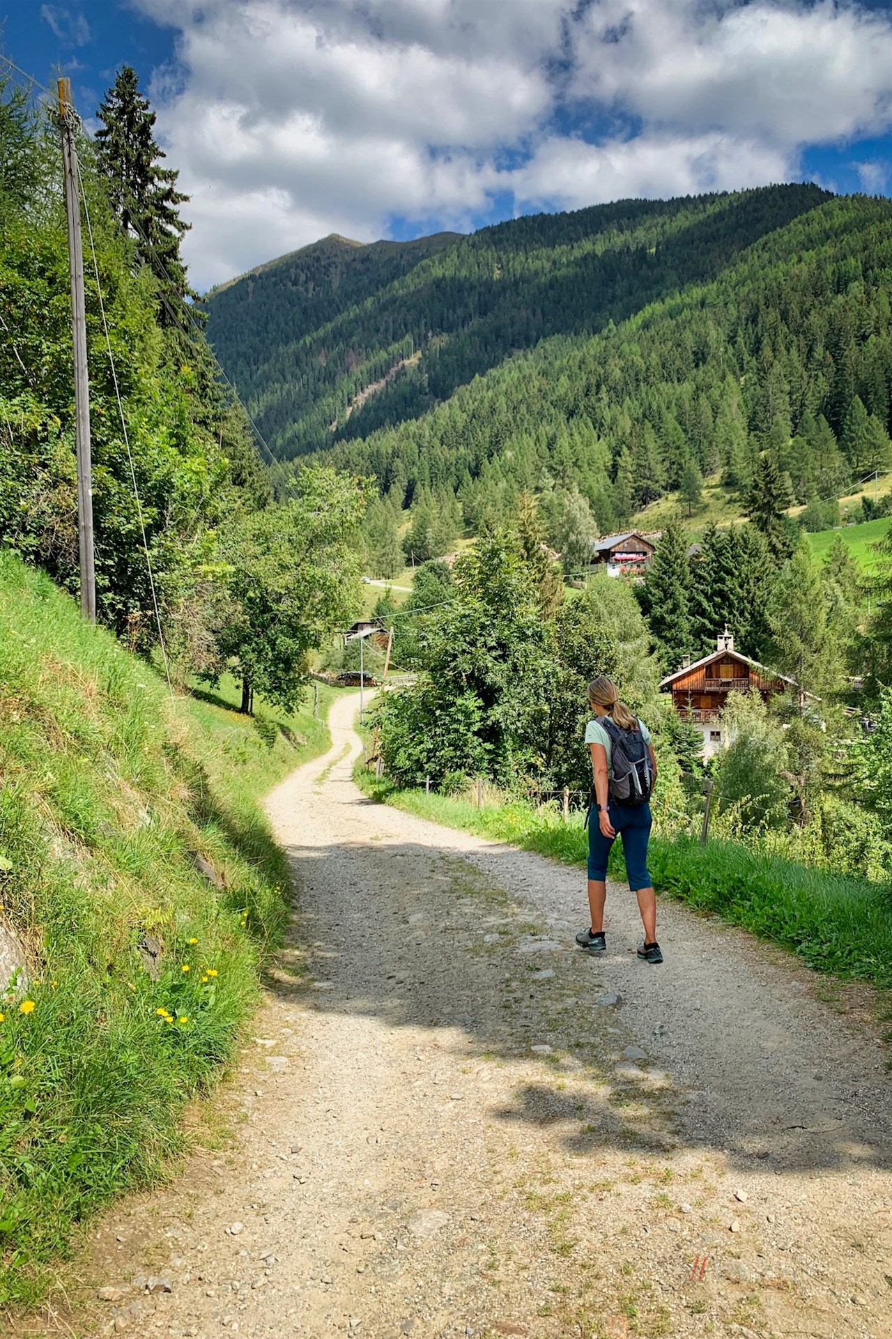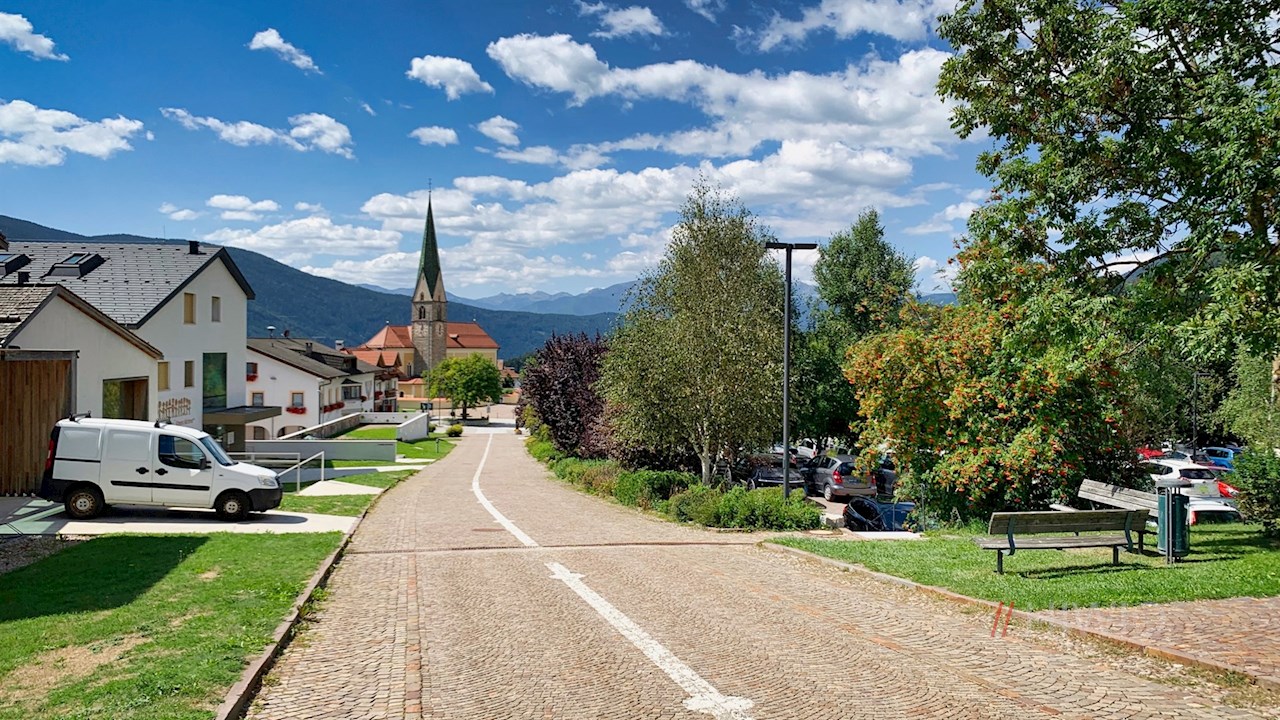 Ausgangspunkt der Wanderung zur Astnerbergalm ist der große Parkplatz in der Dorfmitte Terentens.