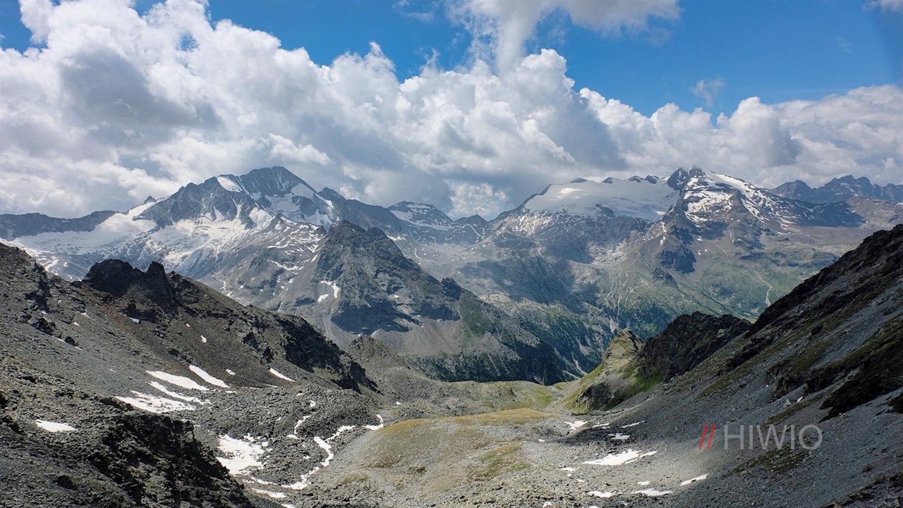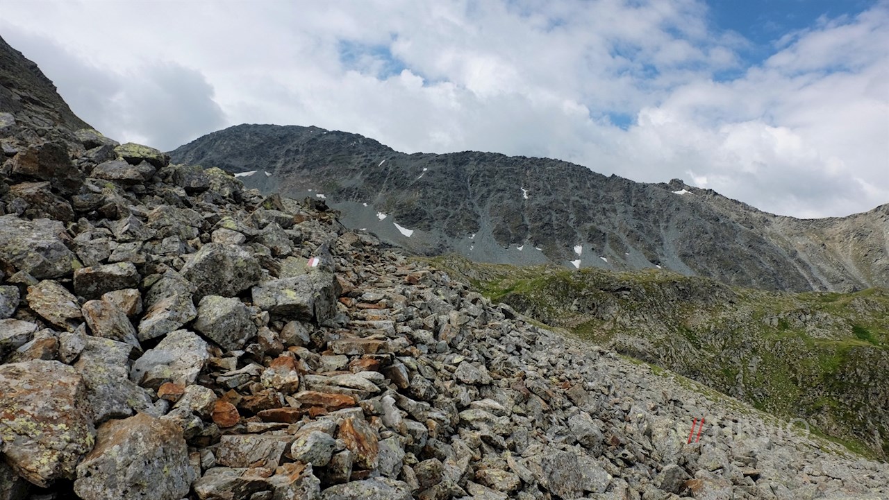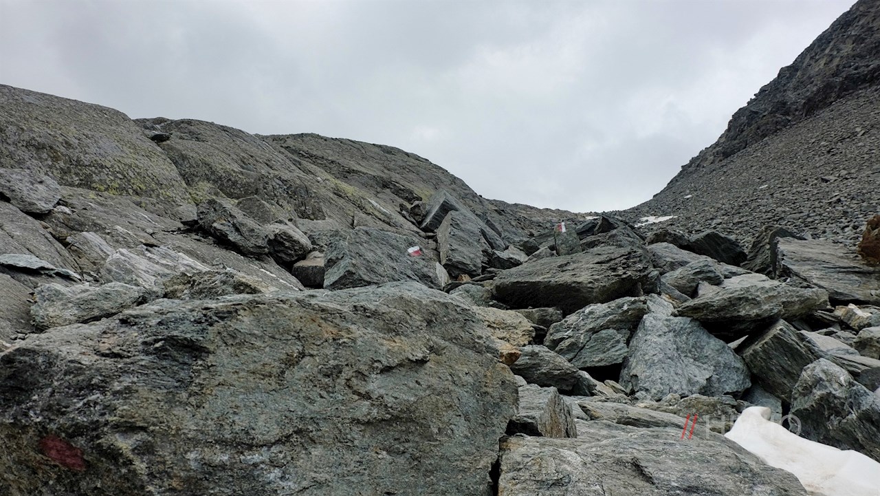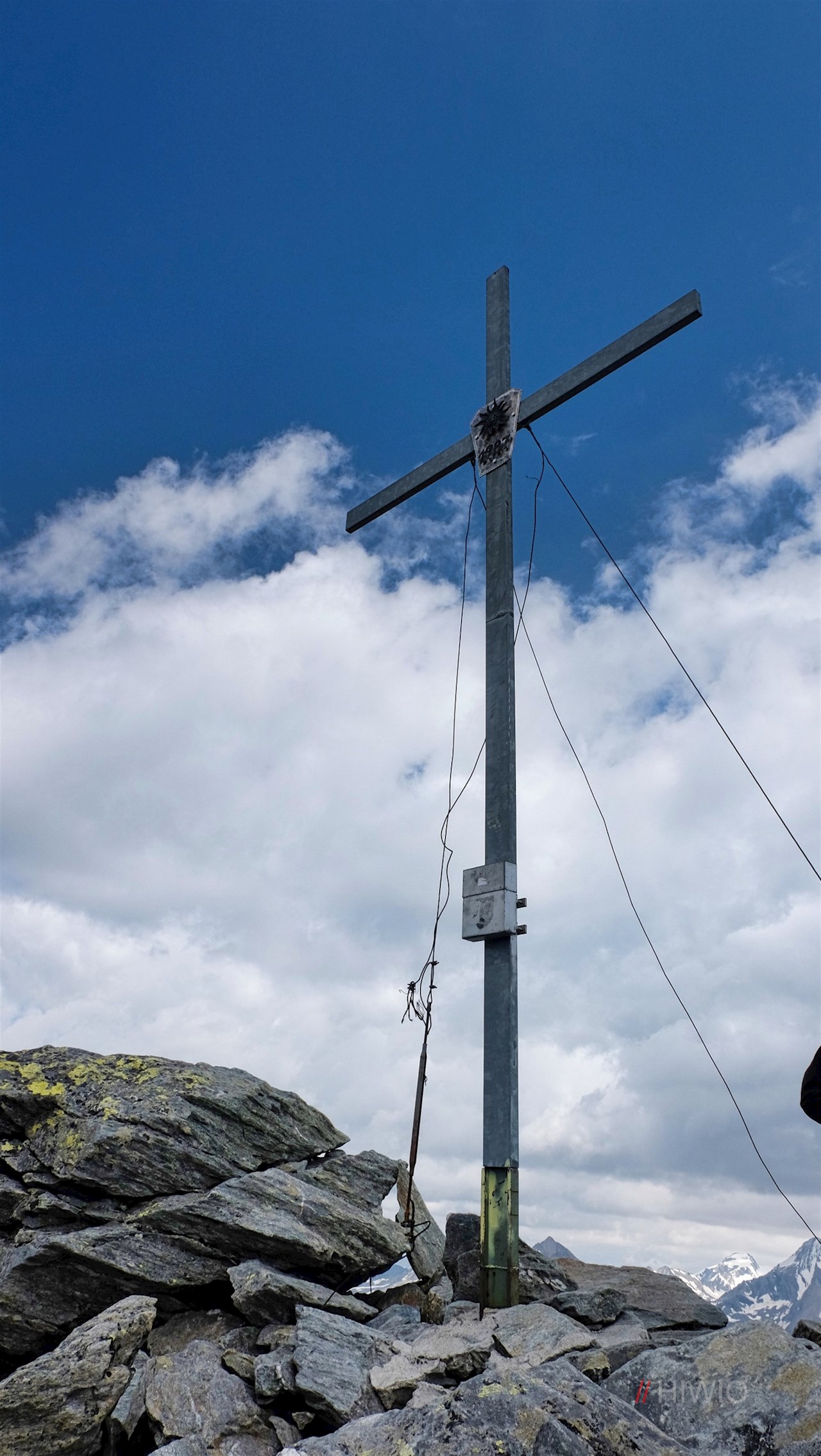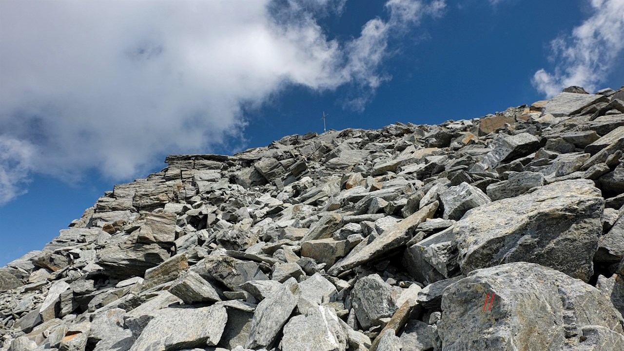 Zuletzt folgt der steile Anstieg über die schroffen Schieferblöcke dieses markanten Dreitausenders. Wenngleich der Aufstiegsweg über den Südrücken nicht markiert ist, ist er dank der Steinmännchen und des gut sichtbaren Gipfelkreuzes dennoch leicht zu finden.