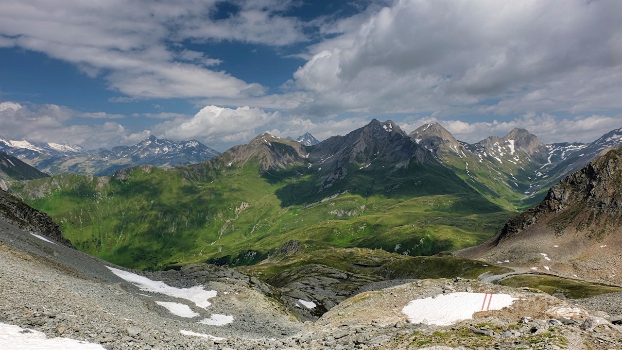 Beim schlichten Eisenkreuz der Dreieckspitze auf 3.031 m Höhe angekommen, werden die Mühen des Aufstiegs mit einem malerischen Fernblick auf die Osttiroler Berge, die Durreckgruppe und den Zillertaler Hauptkamm mit seinen mächtigen, schneegeschmückten Gletschern belohnt.
