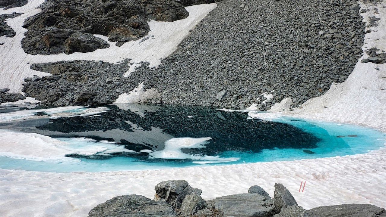 Weiterhin der Wegnummer 9A folgend, setzt sich die Wanderung über felsdurchsetzte Hänge, Blockwerk, Schotter und zumeist einige Schneefelder zur Bärenluegscharte (2.848 m) fort. Unterwegs trifft man auf den kleinen, in einen Gebirgskessel eingebetteten Karsee.