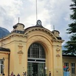 1881 also wurde die aufstrebende Kurstadt an das internationale Schienennetz angeschlossen. Damals war der Bahnhof noch stadtnaher gelegen. Das heutige Jugendstil-Bahnhofsgebäude im Westen der Stadt geht indes auf das Jahr 1906 zurück: Im Zuge der Errichtung der Linie Meran-Mals wurde der alte Bahnhof abgerissen und durch einen mondäneren, nordwestlicher gelegenen ersetzt.