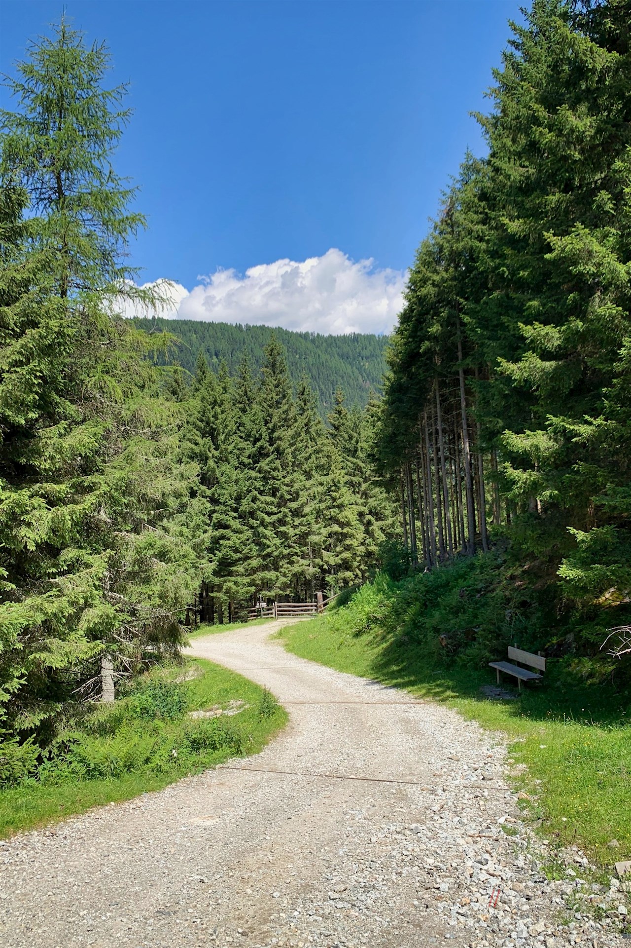 Am Parkplatz weist das Wanderschild Nr. 12A den etwa einstündigen Anstieg zur Bergalm. Er taucht sogleich in einen schattigen Wald ein, durch den er sich sanft seinen Weg bahnt.