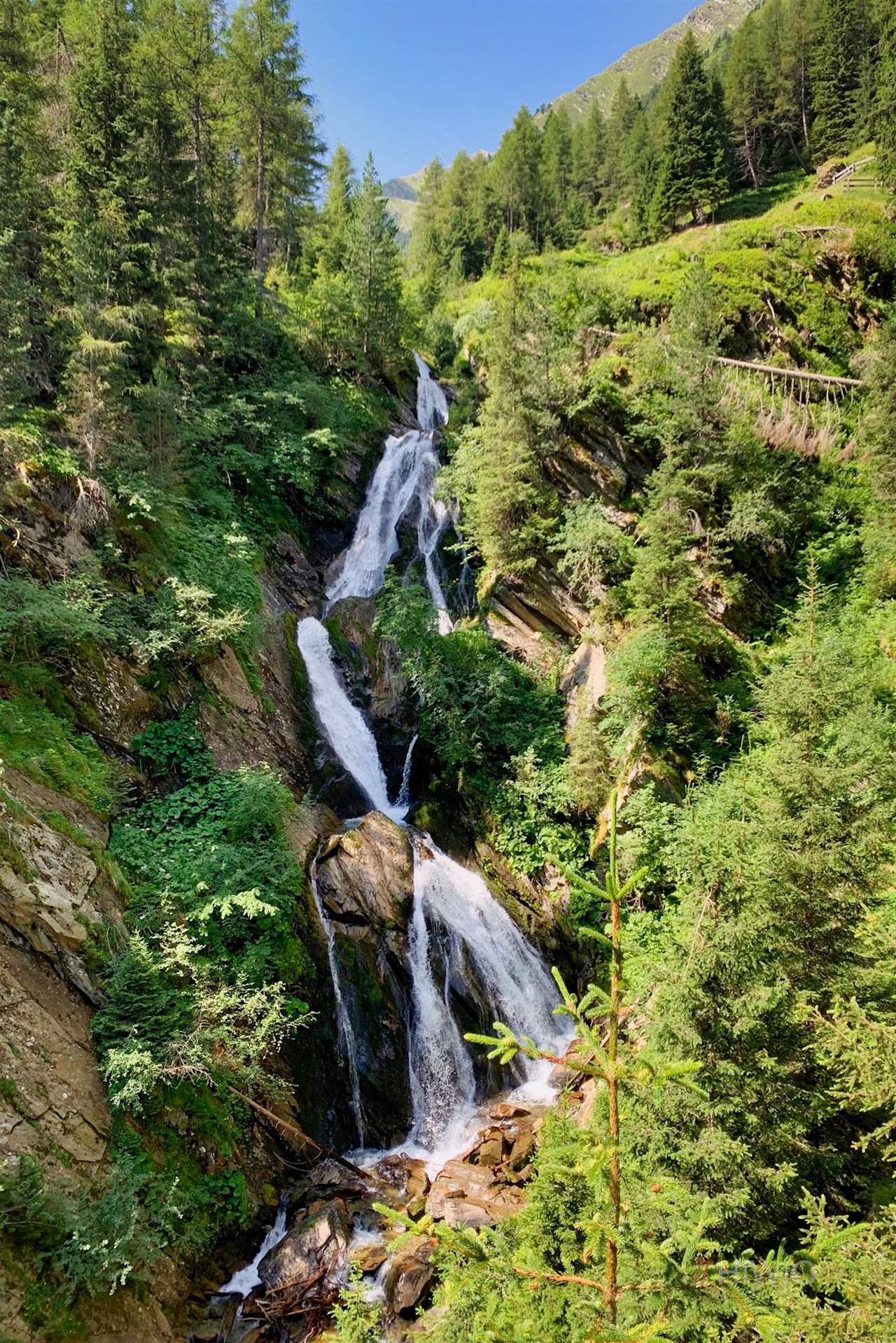 Nach einer guten Viertelstunde gemütlichen Wanderns zweigt am rechten Wegesrand ein liebevoll angelegter, teils mit Brücken und Holzstegen gesicherter Steig zum Wasserfall Gurgl ab. Er führt zu einer Aussichtsplattform, auf der sich ein schöner Ausblick auf den rauschenden, über farn- und moosbewachsene Felsen herabfallenden Wasserfall öffnet. Eine Aussichtsbank lädt zum Genießen dieses kleinen Naturschauspiels ein.