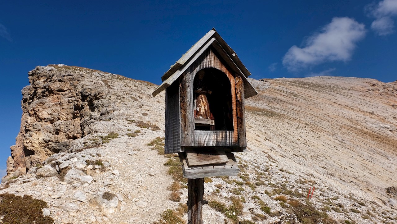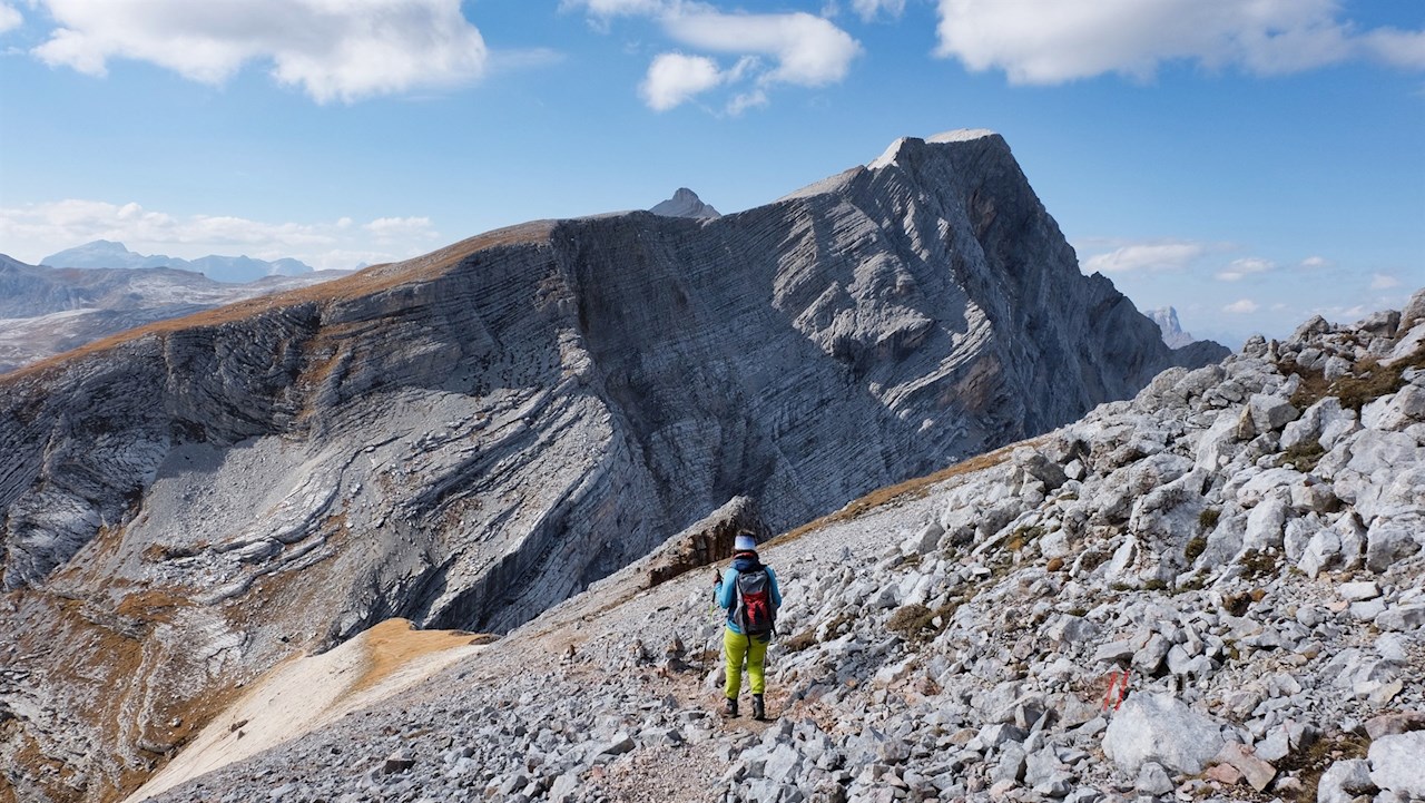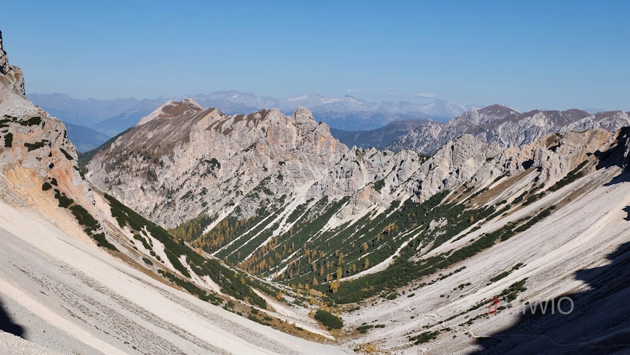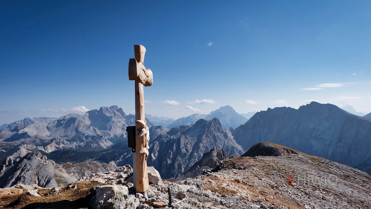 Auf 2.655 m Höhe erschließt sich schließlich ein im wahrsten Sinne des Wortes schwindelerregend schöner Ausblick: Während ringsum markante Dolomitengipfel wie der Peitlerkofel, der Muntejela de Senes, der Seekofel, die Hohe Gaisl, der Col Bechei, die Tofane oder die Lavarella in die Höhe ragen, zeichnen sich in der Ferne die Zillertaler Alpen ab.