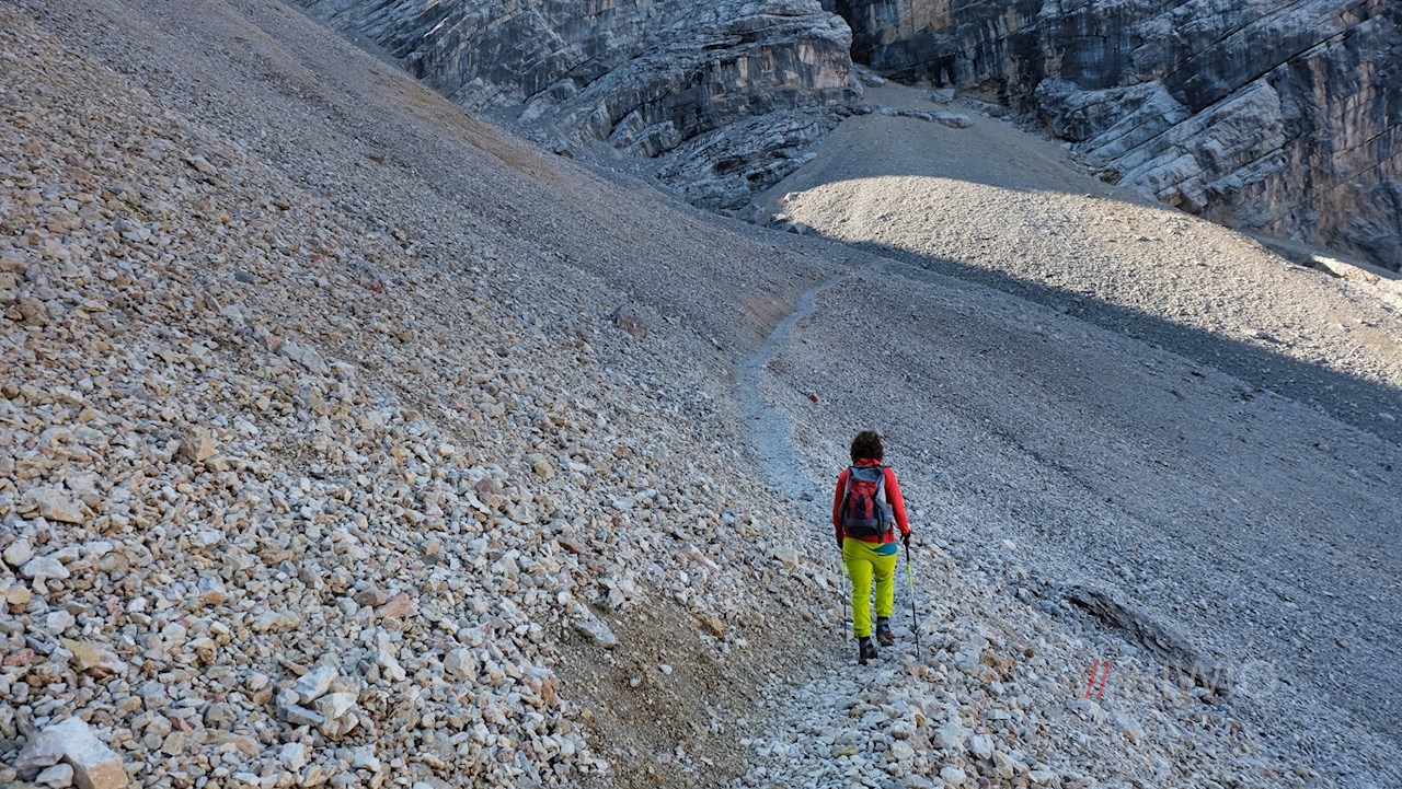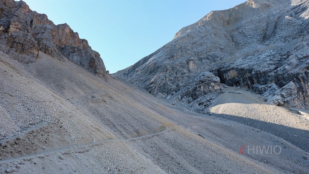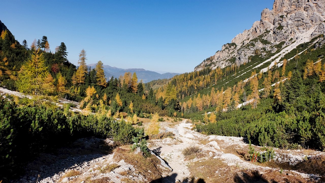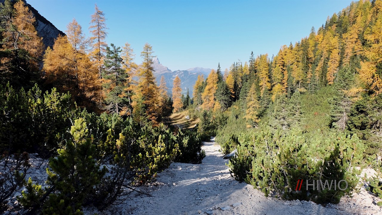 Wenig später zweigt am linken Wegesrand der Wanderweg Nr. 13A in Richtung Antoniusjoch / Ju de Sant’Antone ab. Er führt im sanften Anstieg durch einen beständig lichter werdenden Hochwald, hinter dem sich ein geröllreiches, von hohen Felswänden umrahmtes Kar ausdehnt.