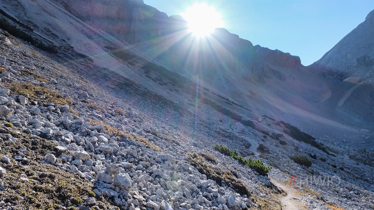 Vor dieser imposanten Kulisse steigt der schmale Steig auf das Antoniusjoch an, das zwischen der Antoniusspitze und dem wuchtigen Neunerkofel eingeschnitten ist.