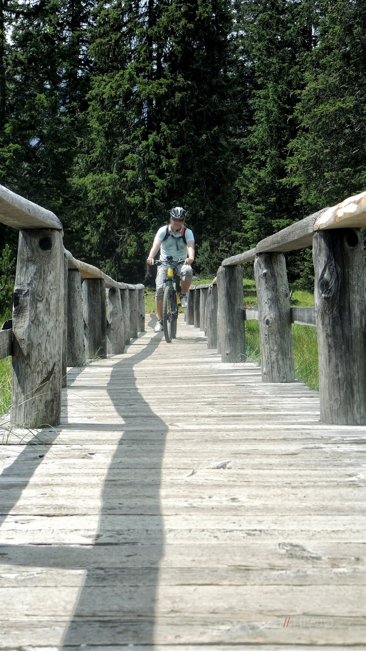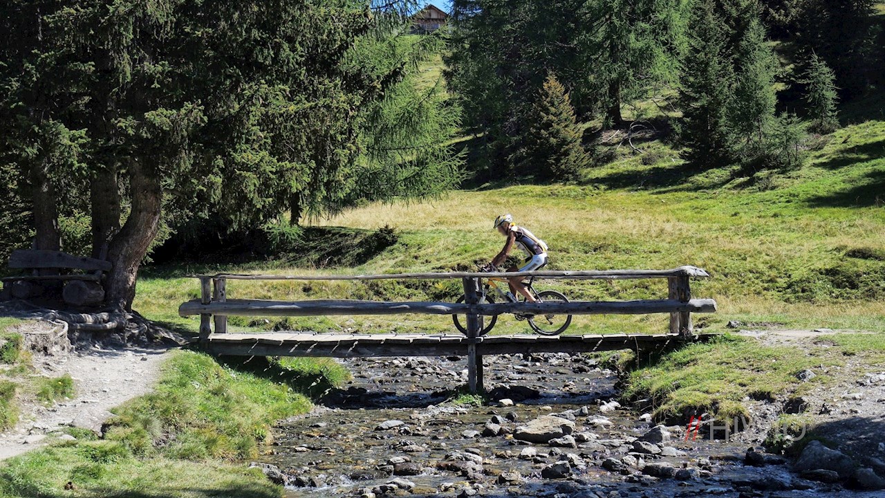 Nach ca. 500 Metern biegen wir links zur Talstation Signaue ab und von dort fahren wir in einem spannenden Mix aus Trails, Wald- und Wiesenwegen bis zum Kreuzbergpass, der natürlichen Grenze zwischen dem deutschsprachigen Südtirol und dem italienischsprachigen Veneto. Direkt an der Passhöhe am Ende vom Parkplatz fahren wir rechts hoch und folgen ab jetzt den Wegweisern Richtung Nemesalm. Der Anstieg ist nicht besonders schwer und im zweiten Teil gibt es sogar zwei kurze Gegenabfahrten, in denen wir die Beine kurz auslockern können. Nachdem wir das Biotop auf den drei Holzbrücken überquert haben, trennen uns nur noch knapp 500 Meter und einige Pedaltritte vom wohlverdienten Kaiserschmarrn in der Nemesalm. Auf der Sonnenterrasse bietet sich ein traumhafter Panoramablick auf die Gipfel der Sextner Dolomiten.