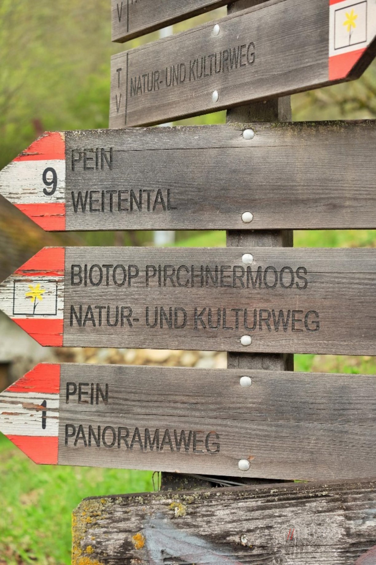 Hier folgt man zunächst der Straße nach unten, bis am Hotel „Tirolerhof“ der Natur- und Kulturweg in Richtung Pirchner Moos abzweigt. Er schlängelt sich im sanften Anstieg durch grüne Wiesen und entlang der wenig befahrenen Höfestraße, von der schließlich der Waldweg Nr. 1A abzweigt.