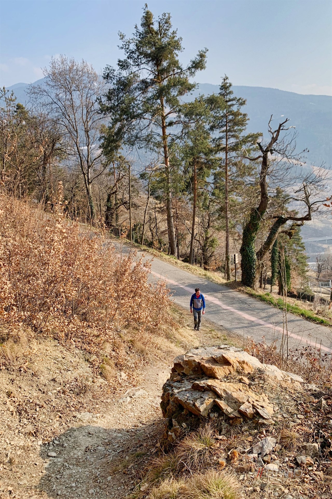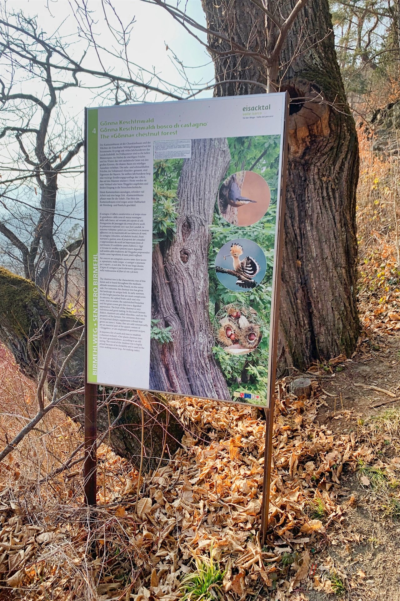 Darunter taucht er alsbald in einen lichten Mischwald ein, in dem zahlreiche, für das Eisacktaler Mittelgebirge so charakteristische Kastanienbäume gedeihen. Da die gleichermaßen aromatische wie nahrhafte „Keschte“ jahrhundertelang zu den wichtigsten Nahrungsmitteln der Bauern zählte, wird der Kastanienbaum im Volksmund noch heute schlicht „Brotbaum“ genannt.